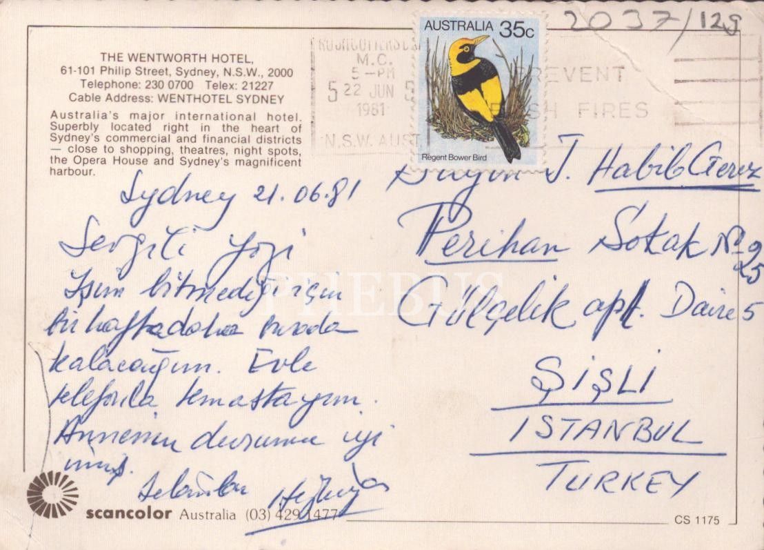 Yazar ve ressam Habib Gerez´e gönderilen 1981 tarihli kartpostal, 9x14 cm