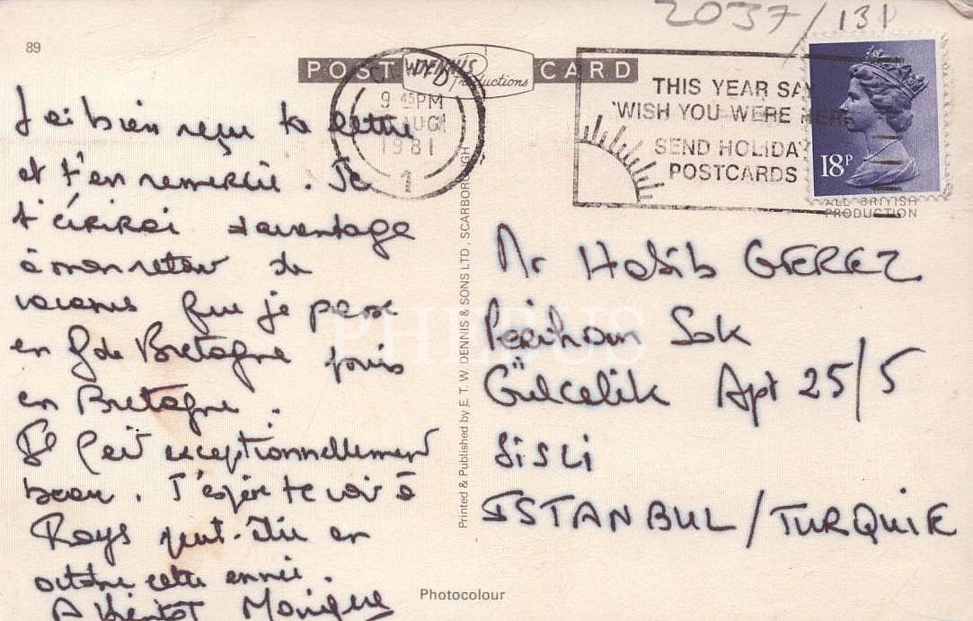 Yazar ve ressam Habib Gerez´e gönderilen 1981 tarihli kartpostal, 9x14 cm