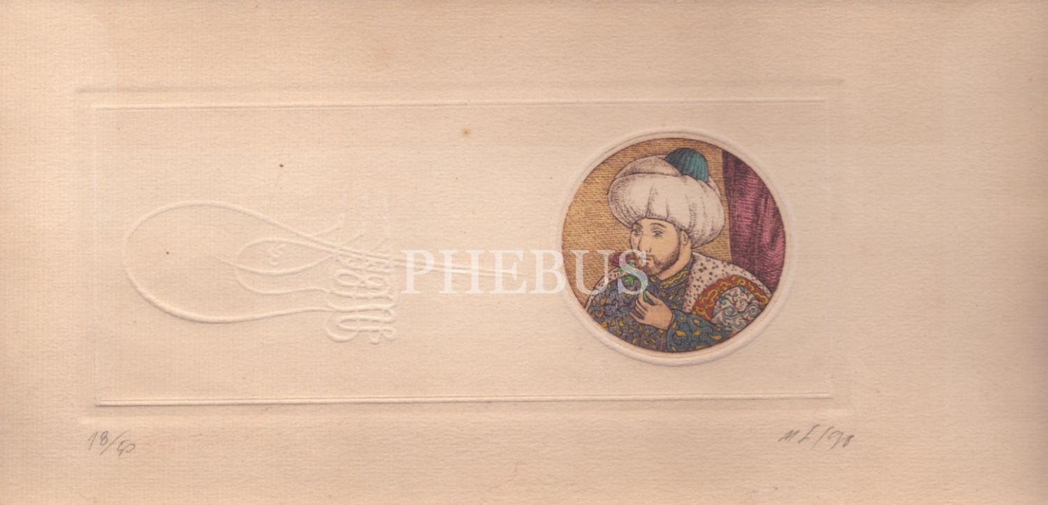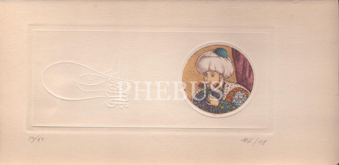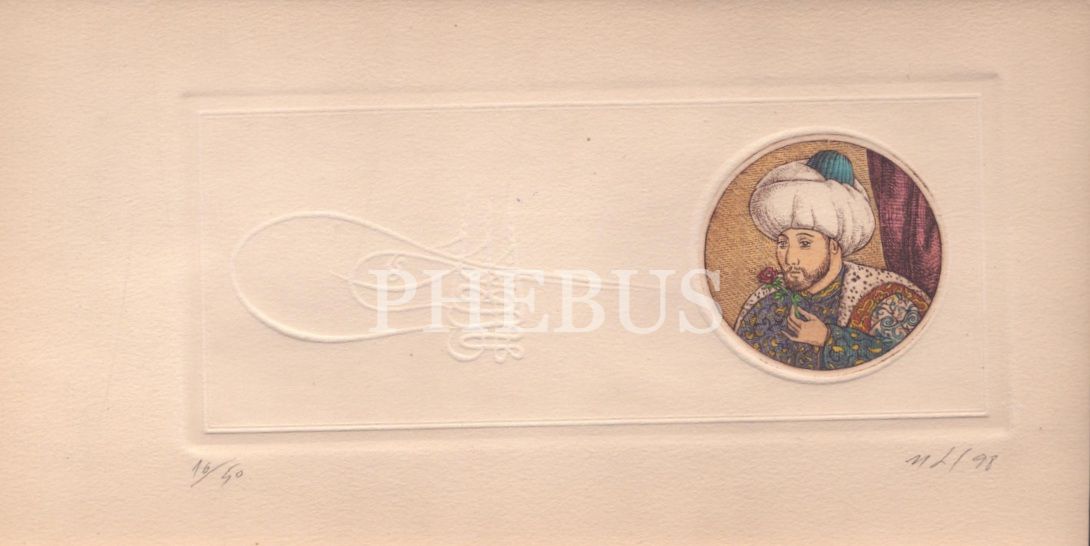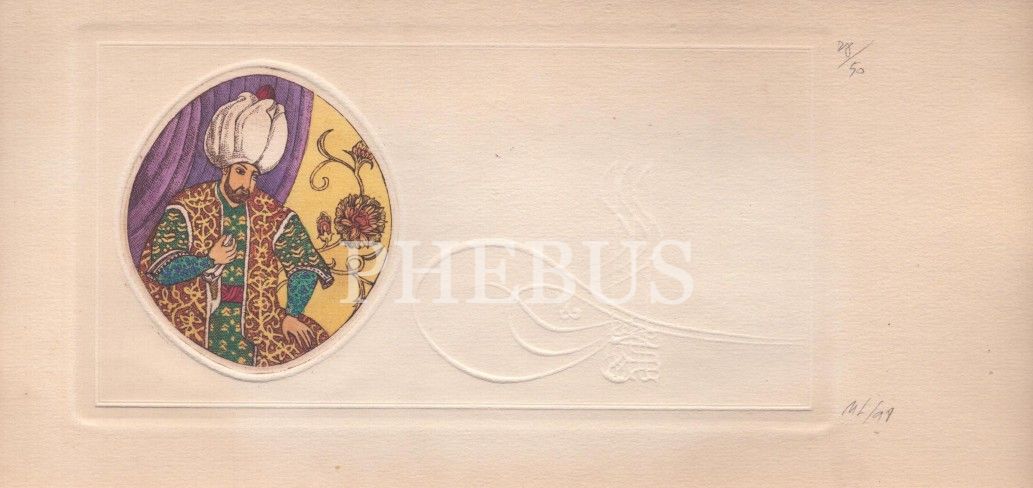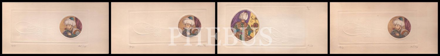 Fatih Sultan Mehmet ve Kanuni Sultan Süleyman gofre tuğralı baskı çizim kart, SOFA art&antiques, 14x29 cm (4 adet)