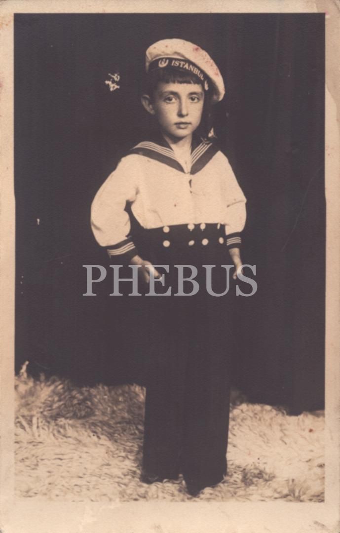 "İstanbul" yazılı denizci şapkası ve kostümüyle poz veren küçük çocuğun ithaflı ve imzalı stüdyo hatıra fotoğrafı, 9x14 cm