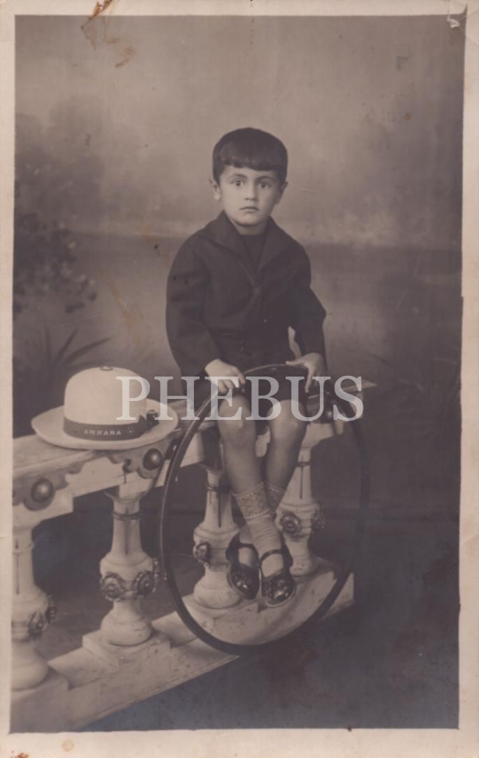 "Ankara" yazılı hasır fötr şapkası ve çemberiyle poz veren küçük çocuğun ithaflı ve imzalı stüdyo hatıra fotoğrafı, 9x14 cm