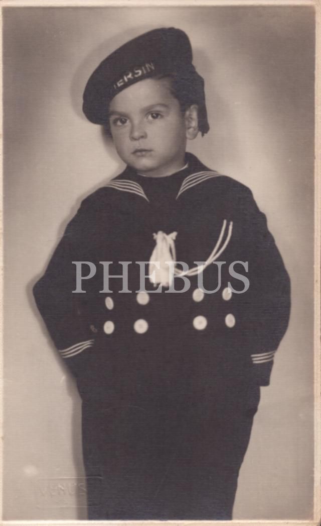 "Mersin" yazılı denizci şapkası ve kostümüyle poz veren küçük çocuğun stüdyo hatıra fotoğrafı, Foto Venüs soğuk damgalı, 9x14 cm