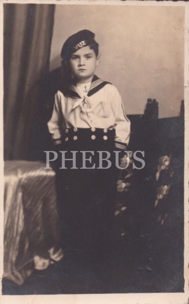 "Yavuz" yazılı denizci şapkası ve kostümüyle poz veren küçük çocuğun "Ar Foto (İstiklâl Caddesi)" damgalı stüdyo hatıra fotoğrafı, 9x14 cm