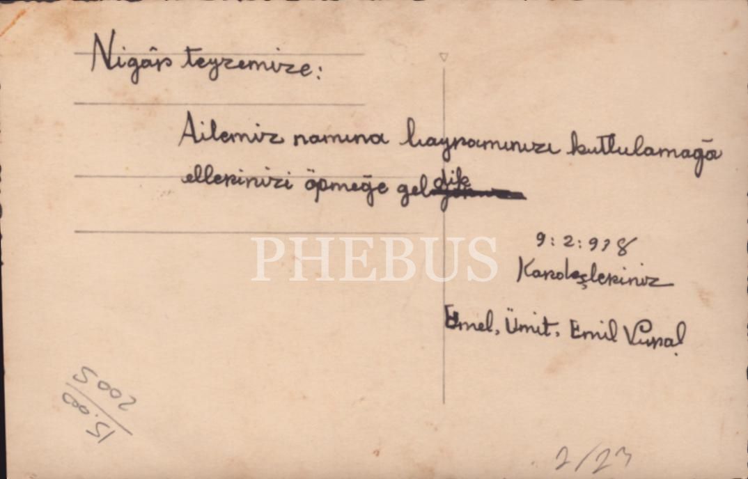 İthaf, "Nigâr Teyzemize: Ailemiz namına bayramınızı kutlulamağa ellerinizi öpmeğe geldik. 9.2.938 Kardeşleriniz. Emel, Ümit, Emir Vural" şeklindedir.