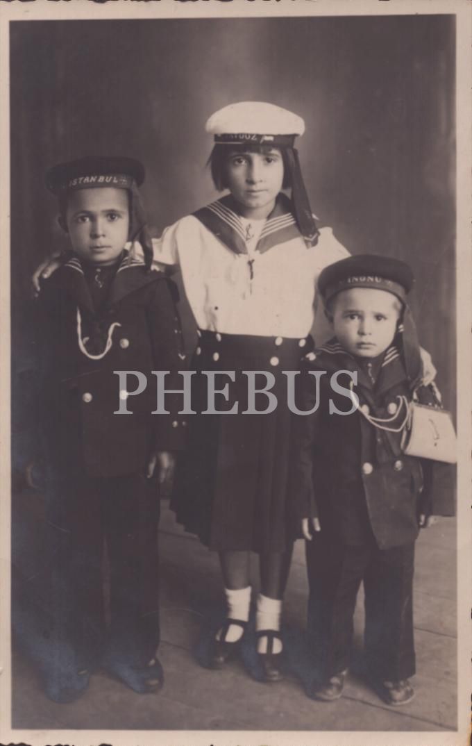 "İstanbul", "Yavuz" ve "İnönü" denizci şapkaları ve kostümleriyle poz veren üç küçük kardeşin bayram tebrikli stüdyo hatıra fotoğrafı, 9x14 cm