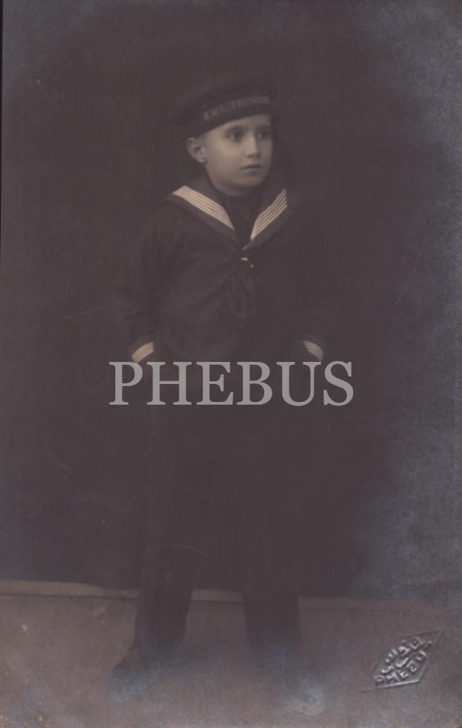 "H.M.S. Thunderer" yazılı denizci şapkası ve kostümüyle poz veren küçük çocuğun ithaflı ve imzalı, "Phebus" soğuk damgalı stüdyo hatıra fotoğrafı, 9x14 cm