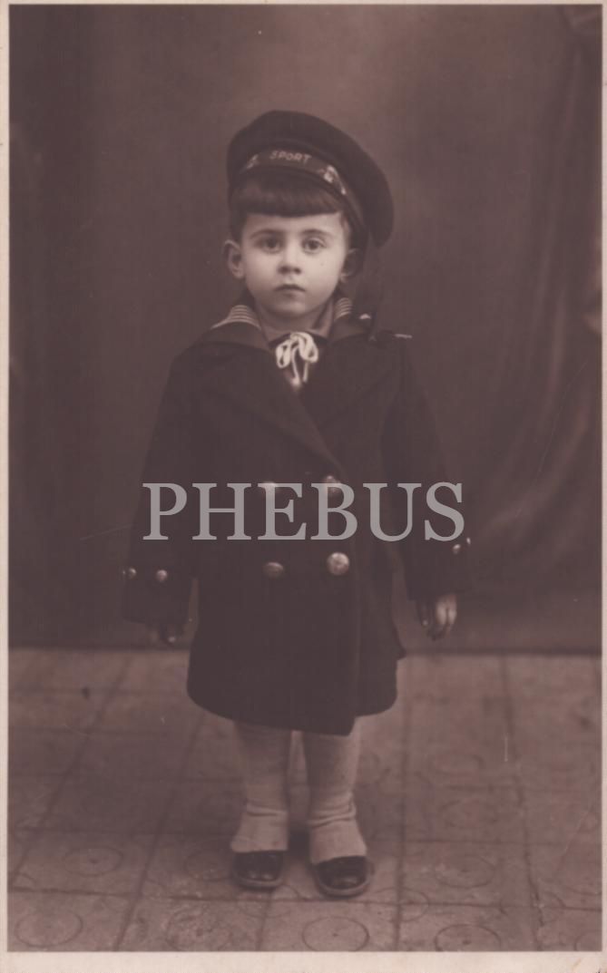 "Sport" yazılı denizci şapkası ve kostümüyle poz veren küçük çocuğun ithaflı ve imzalı, stüdyo damgalı hatıra fotoğrafı, 9x14 cm