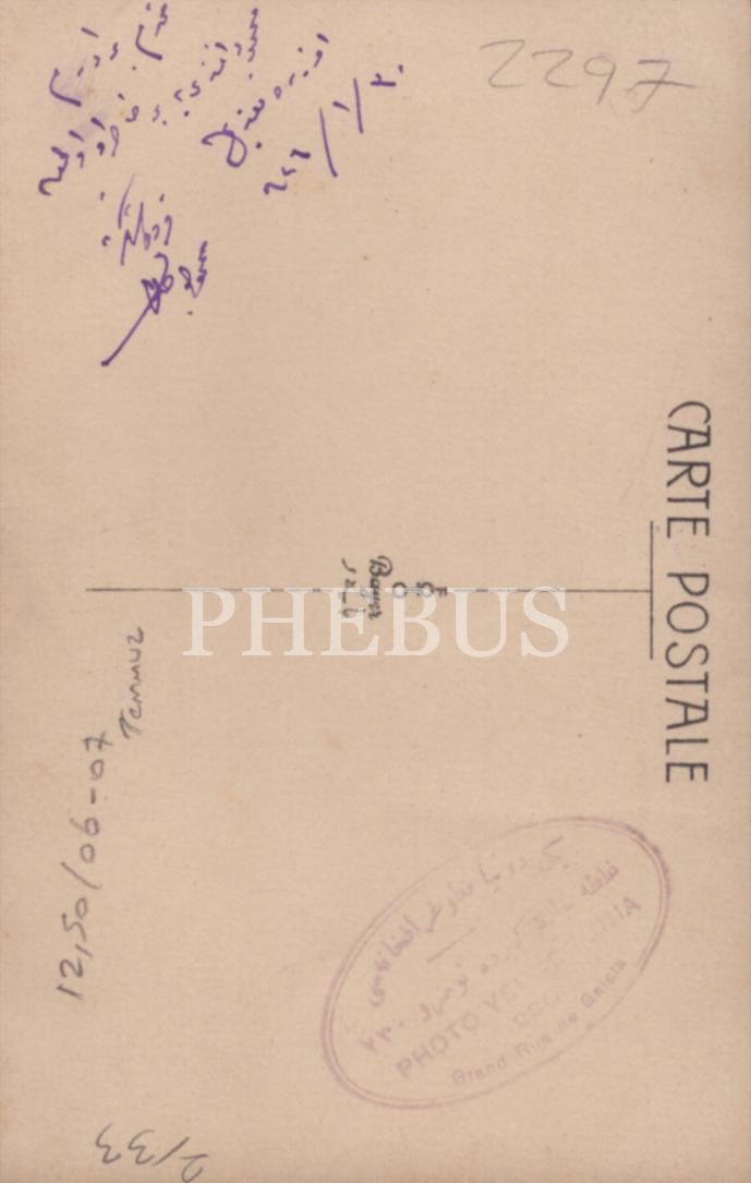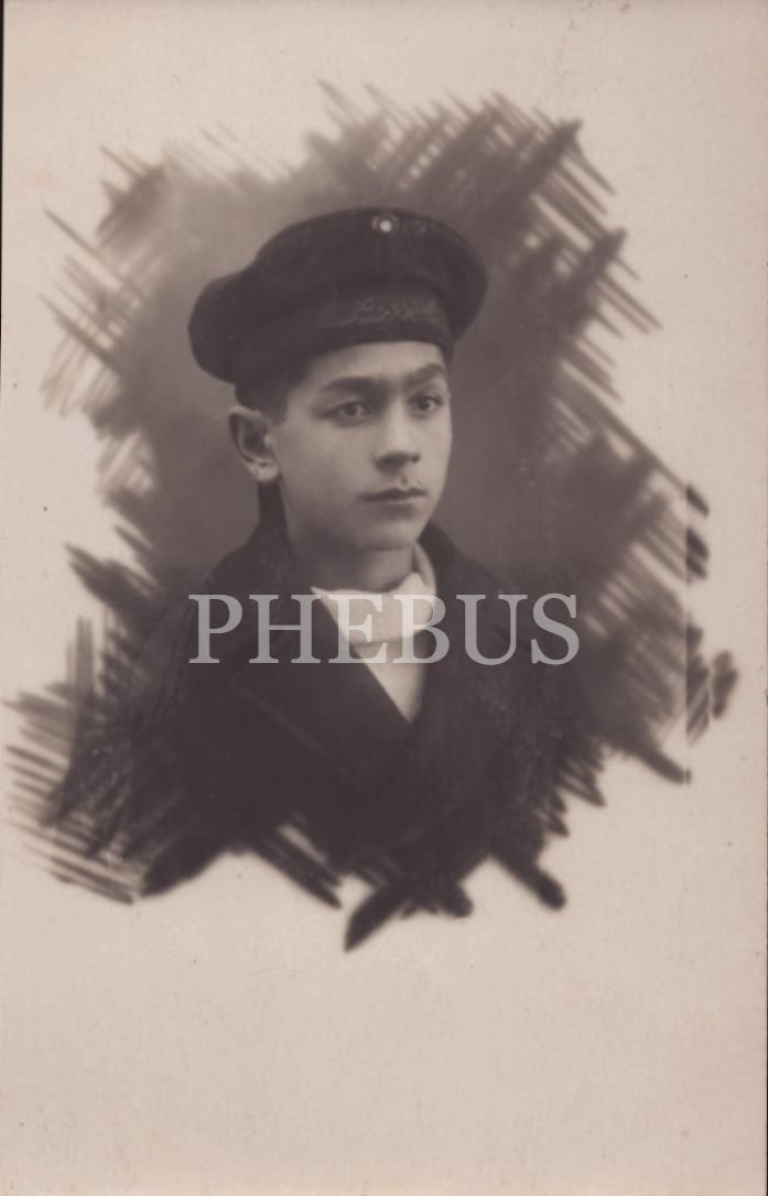 Osmanlıca denizci mektep şapkası ve kostümüyle poz veren gencin ithaflı ve imzalı, "Yeni Dünya Fotoğrafhanesi (Galata)" damgalı stüdyo hatıra fotoğrafı, 9x14 cm