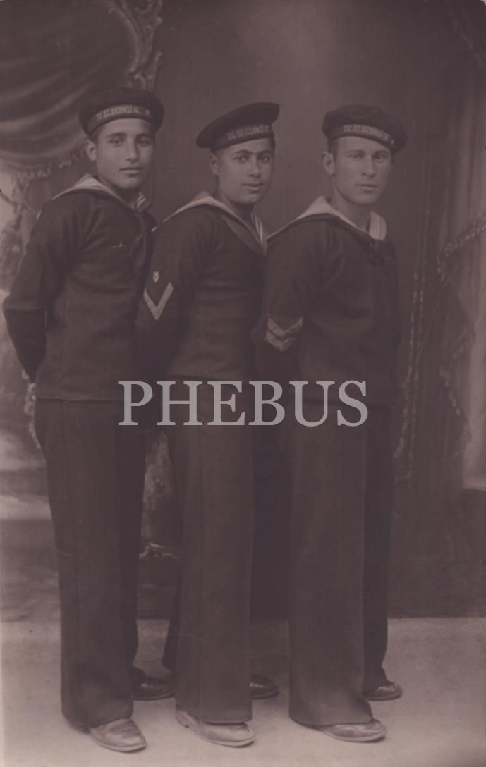 "T.C. Dz. Gedikli..." yazılı şapkaları ve üniformalarıyla poz veren üç denizci askerin ithaflı ve imzalı, "Foto Şık (İstiklâl Caddesi)" damgalı stüdyo hatıra fotoğrafı, 9x14 cm