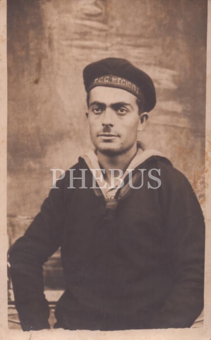 "TCG Mecidiye" yazılı şapkası ve üniformasıyla poz veren denizci askerin stüdyo hatıra fotoğrafı, 9x14 cm