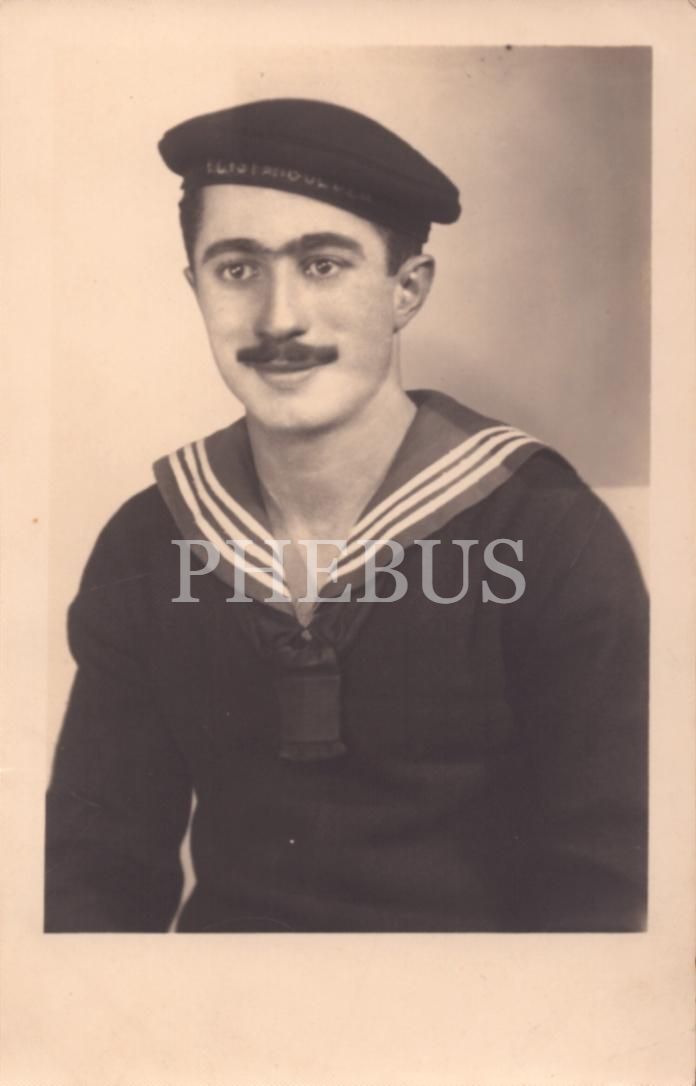 Şapkası ve üniformasıyla poz veren denizci askerin ithaflı ve imzalı stüdyo hatıra fotoğrafı, 9x14 cm