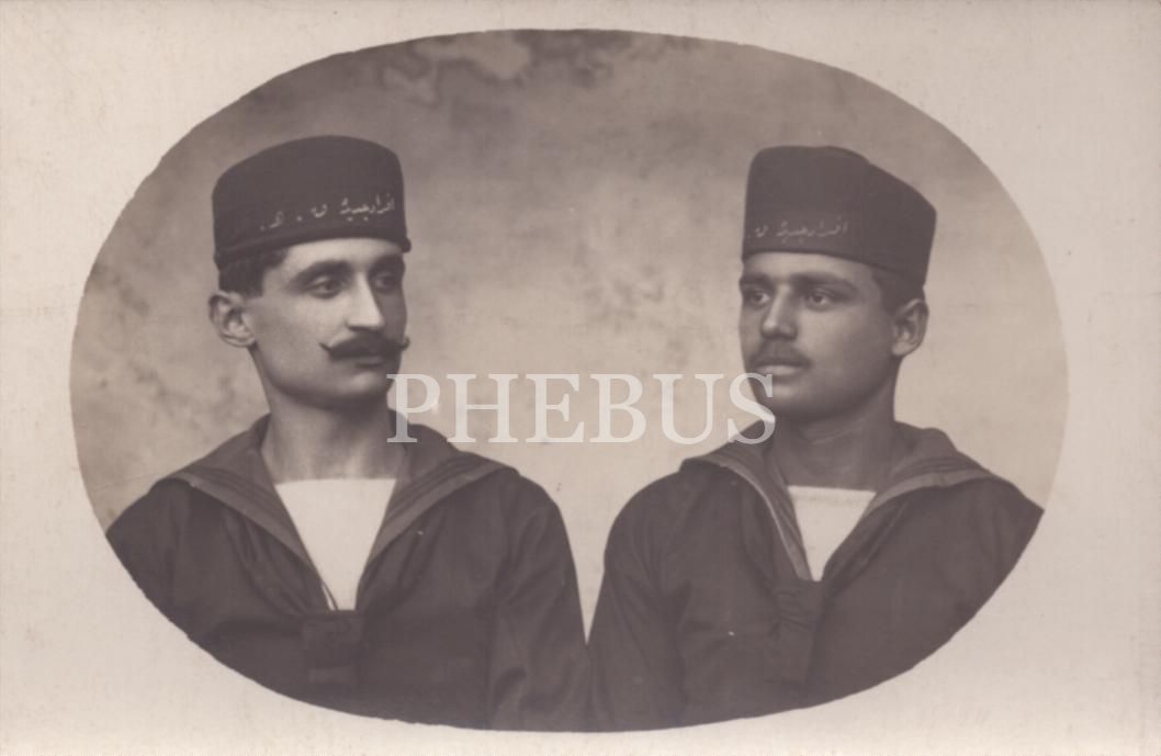 Osmanlıca "Efrâd-ı Cedide K.H." yazılı şapkaları ve üniformalarıyla poz veren iki denizci askerin stüdyo hatıra fotoğrafı, 14x9 cm