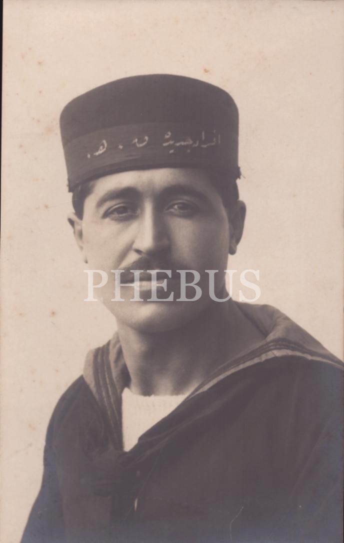 Osmanlıca "Efrâd-ı Cedide K.H." yazılı şapkası ve üniformasıyla poz veren denizci askerin stüdyo hatıra fotoğrafı, 9x14 cm