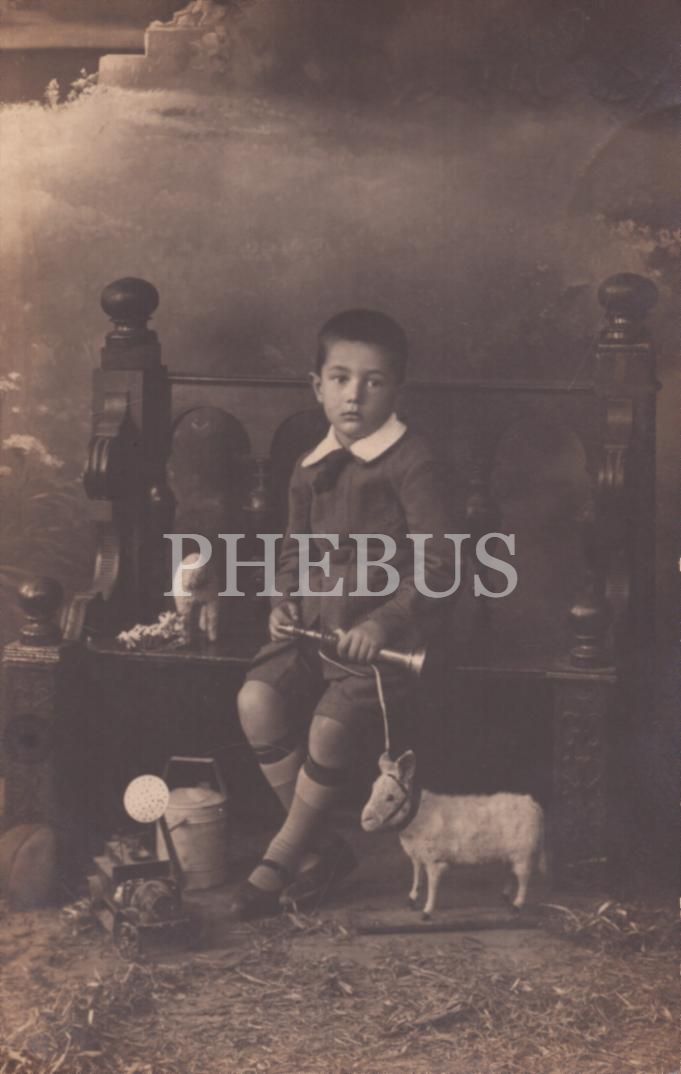 Oyuncaklarıyla poz veren küçük çocuğun "27 Eylül 1341" tarihli stüdyo hatıra fotoğrafı, 9x14 cm