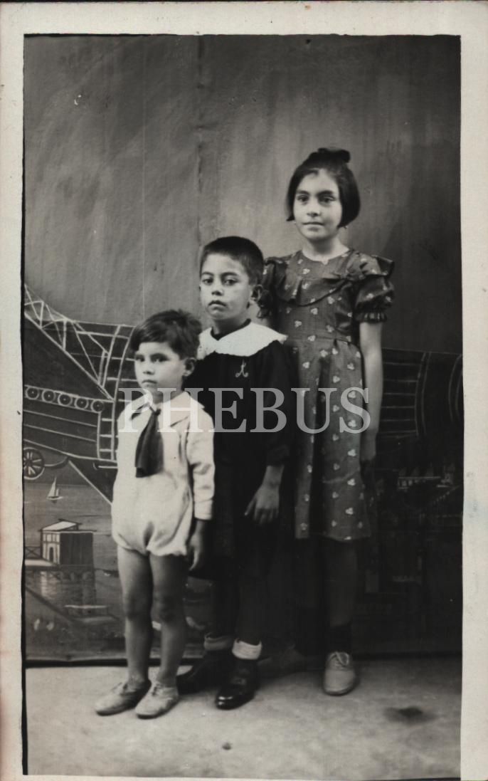 Tayyareli fon perdesi önünde üç küçük kardeşin hatıra fotoğrafı, 9x14 cm
