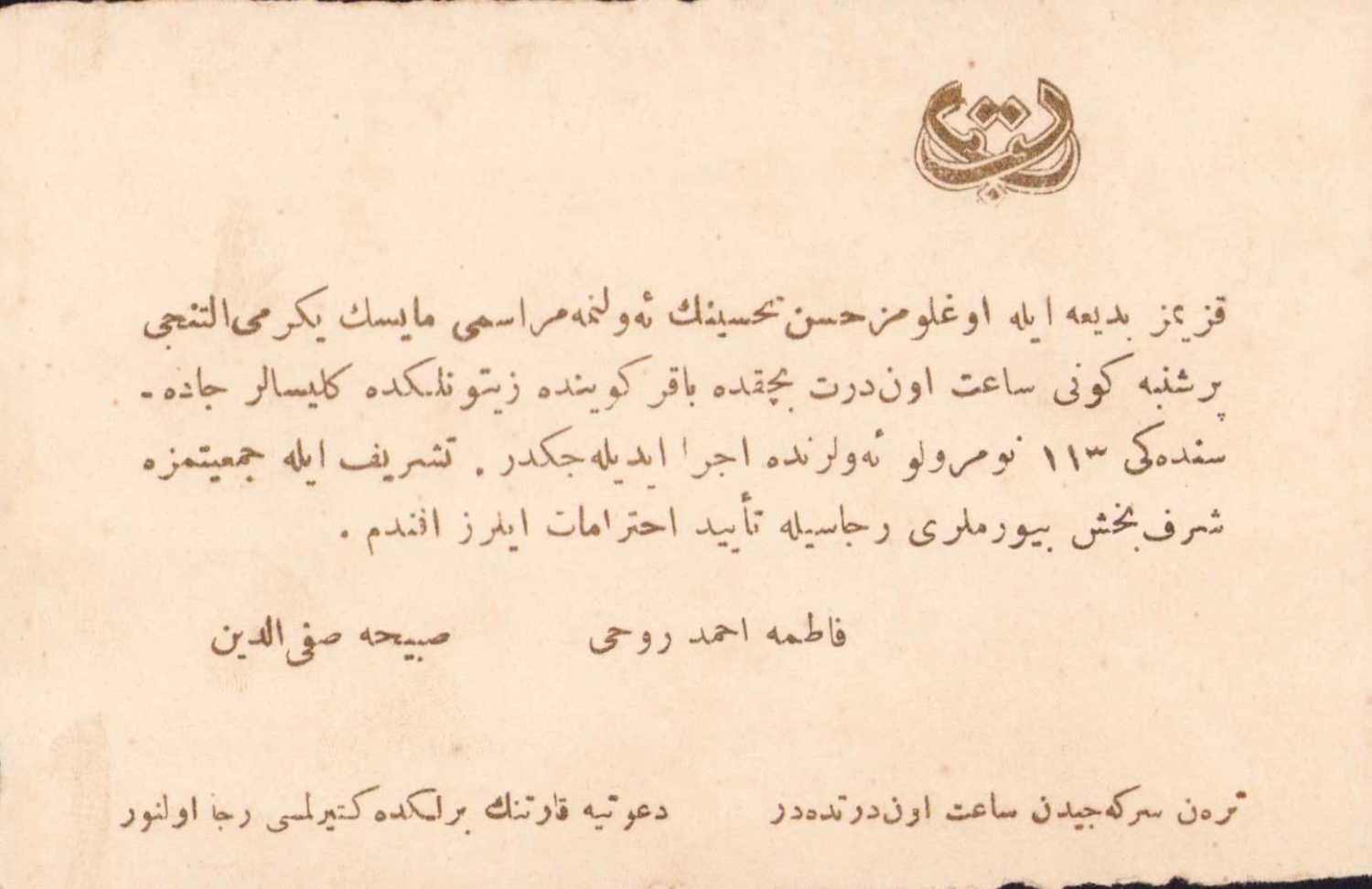 Osmanlı dönemi düğün davetiyesi, Zeytinlik Kilise Caddesi adresli, 26 Mayıs tarihli, kendi zarfında, 14x9 cm