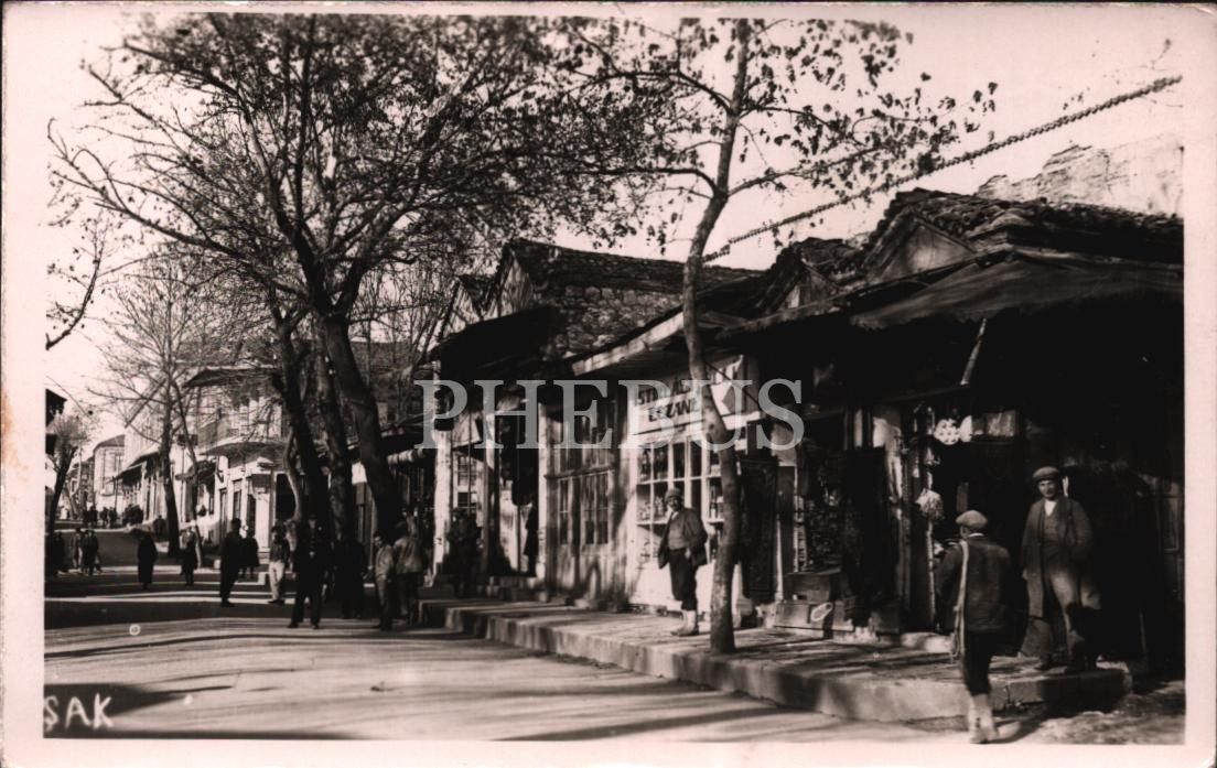 "İstiklâlî Millî Eczanesi" tabelasının dikkat çektiği Uşak Çarşı görünümü, 14x9 cm