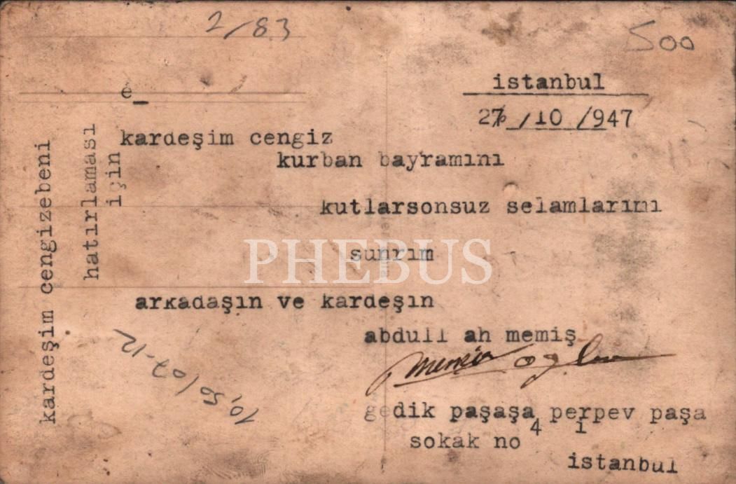 Daktiloyla kaleme alınan bayram tebriği, "İstanbul 27/10/947 Kardeşim Cengiz, Kurban Bayramını kutlar, sonsuz selamlarımı sunarım. Arkadaşın ve Kardeşin Abdullah Memiş." şeklindedir.