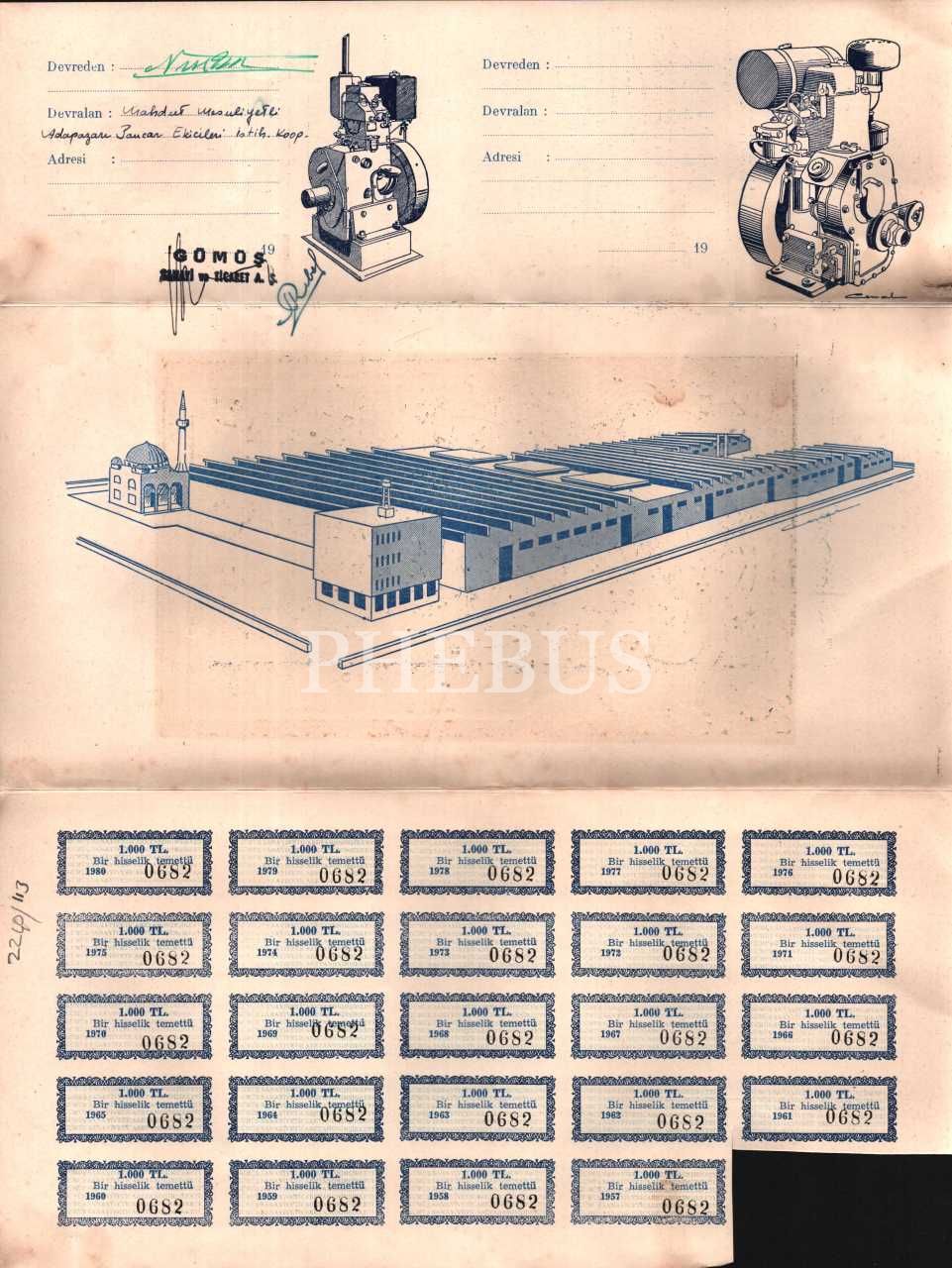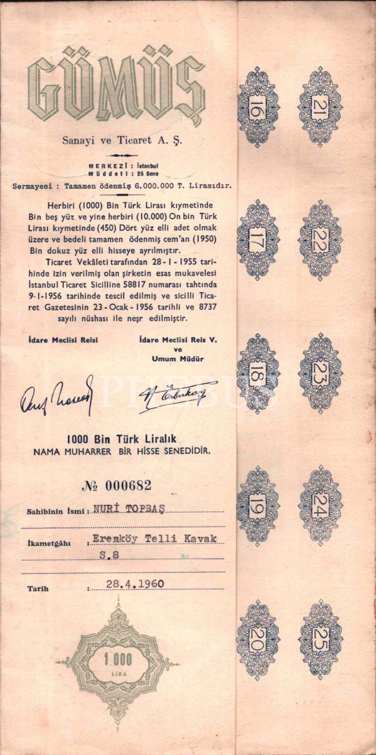 Erenköy cemaati şeyhlerinden Osman Nuri Topbaş'a ait Gümüş Sanayi ve Ticaret A.Ş. hisse senedi, Genel Müdür Necmettin Erbakan baskı imzalı, 1960 tarihli, 30x40 cm