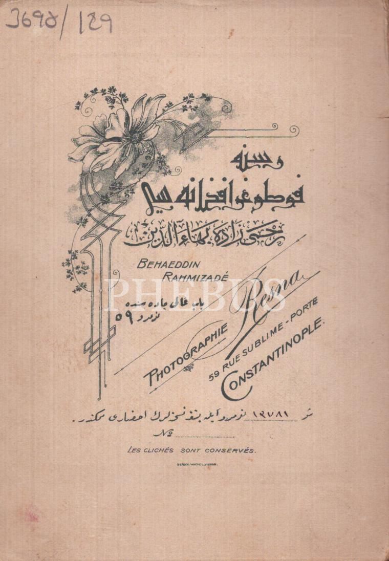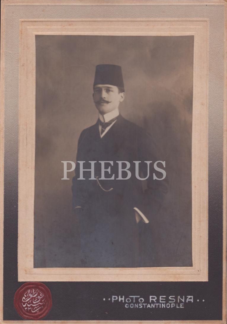 İpek kart- Fesli şık giyimli beyefendinin kabin fotoğrafı, Resne Fotoğrafhanesi- Constantinople, 10x14 cm