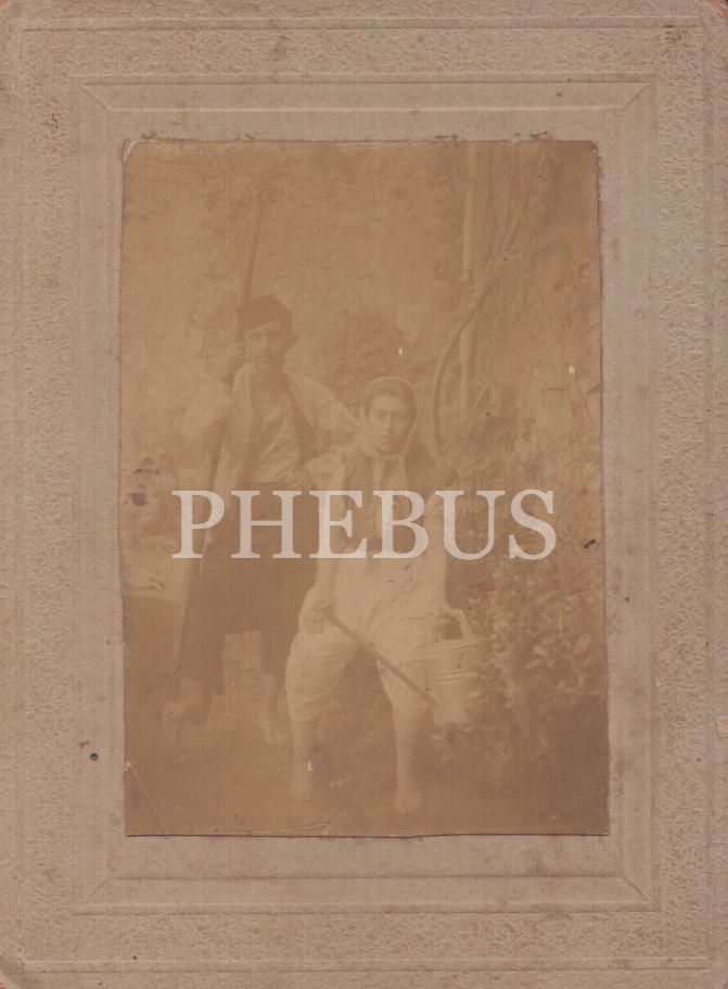 Ellerinde çapa ve bitki suluğu ile fidan diken çıplak ayaklı beyefendi ile hanımefendi, 9x12 cm