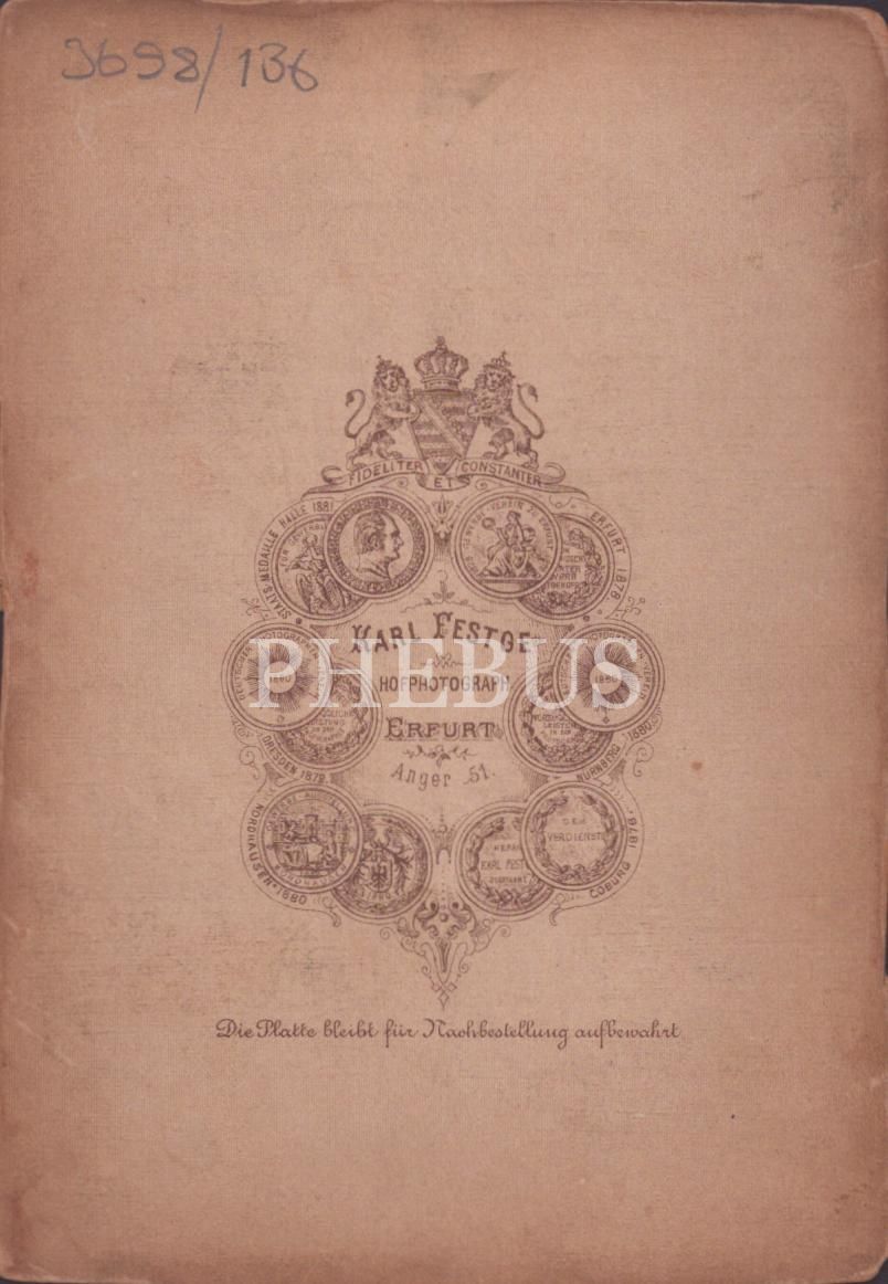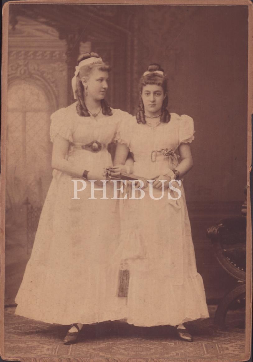 Bukleli saçları ve beyaz elbiseleriyle bir örnek giyinen iki hanımefendinin kabin fotoğrafı, Foto Karl Festge, 10x15 cm