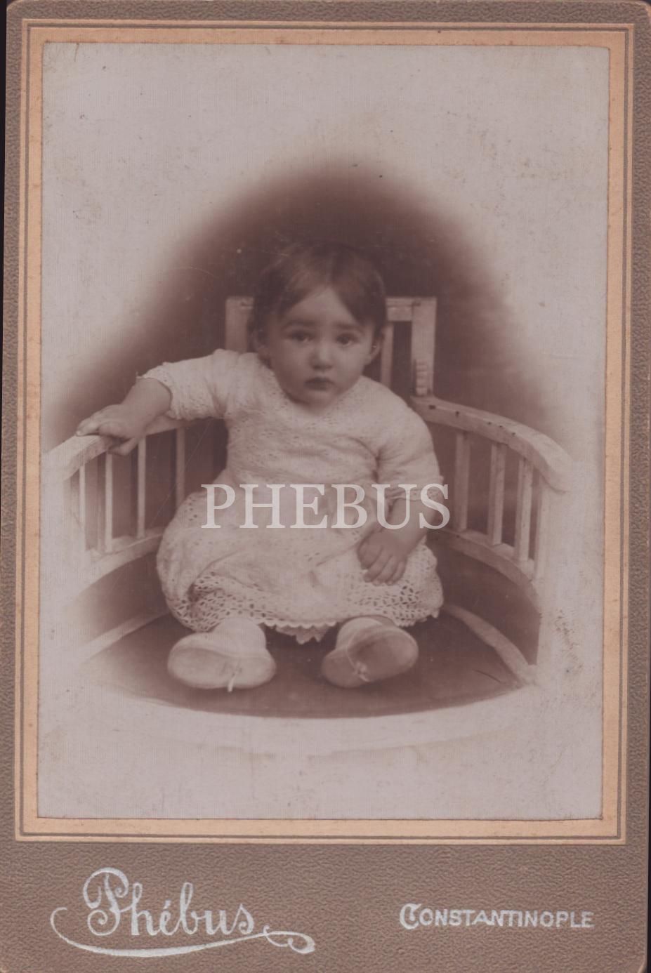 Şaşkın bakışları ile kameraya poz veren bebek, Phebus Fotoğrafhanesi- Constantinople, 12x18 cm