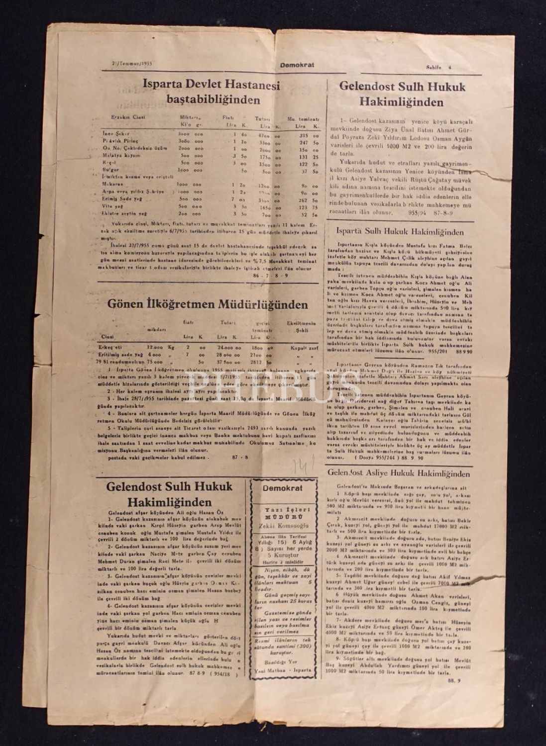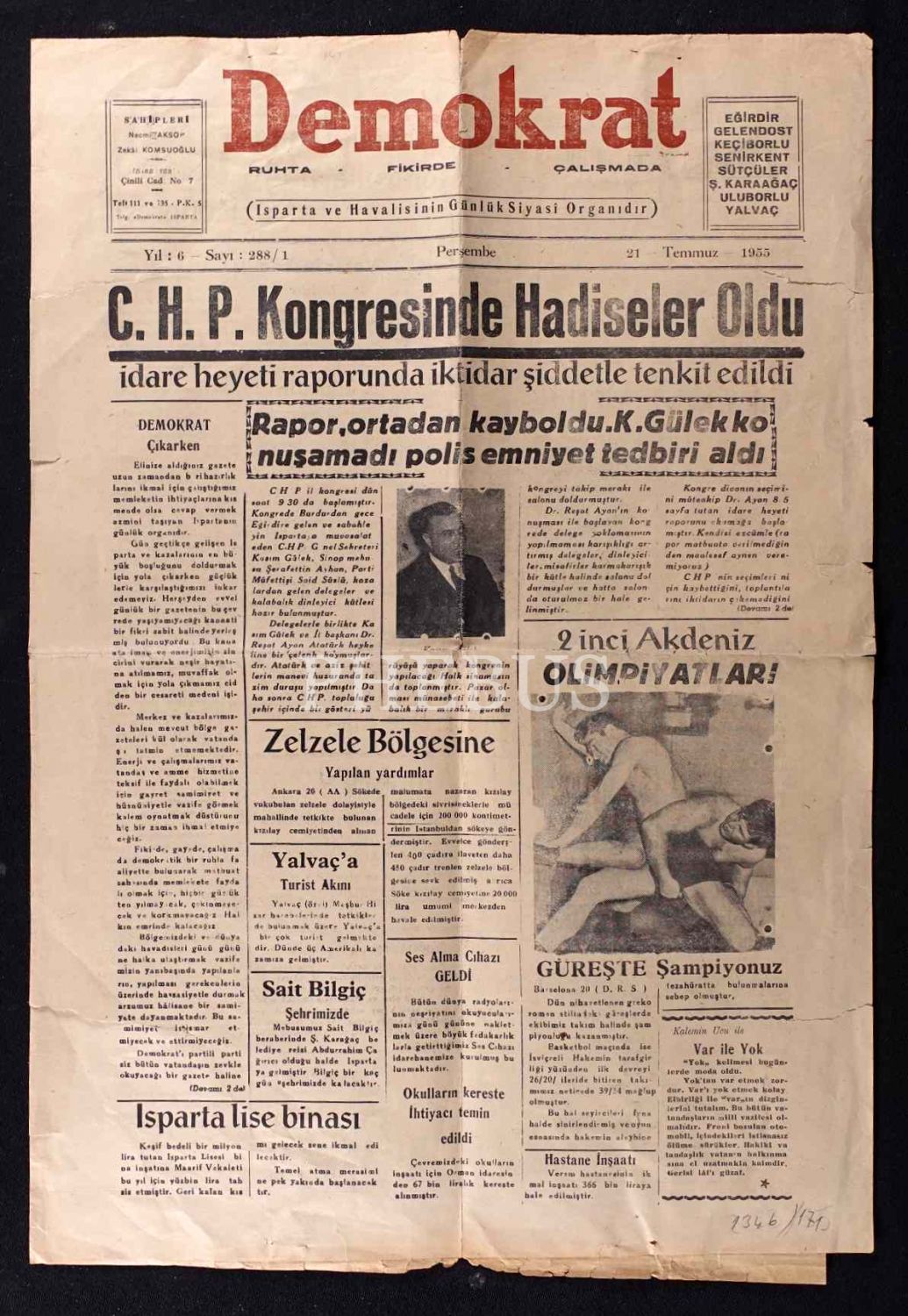 Isparta ve Havalisinin Günlük Siyasî Organı DEMOKRAT gazetesinin 288. sayısı, 21 Temmuz 1955, 35x50 cm