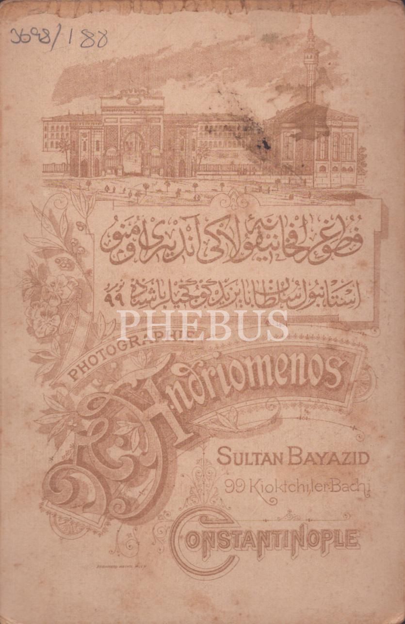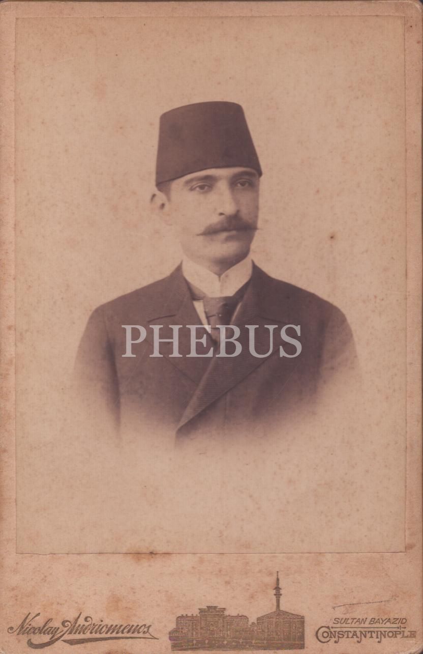 Fesli şık giyimli beyefendinin kabin fotoğrafı, Nicolay Andriomenos Fotoğrafhanesi- Constantinople, 11x16 cm