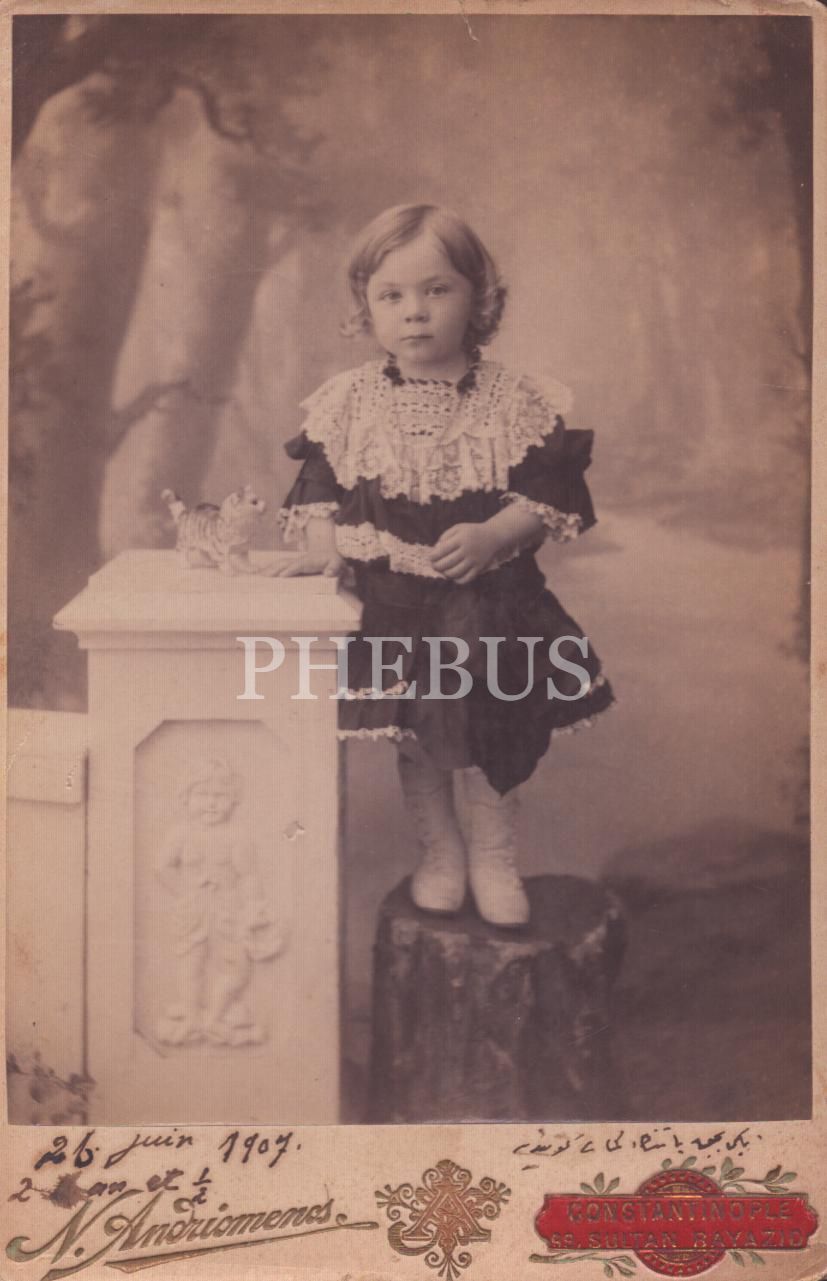 Oyuncak kedisiyle poz veren sevimli miniğin kabin fotoğrafı, 1907, N. Andriomenos Fotoğrafhanesi- Constantinople, 11x16 cm