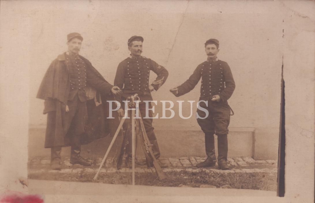 Tüfek ve kılıçlarıyla poz veren yabancı subaylar, arkası Fransızca yazılı ve 1910 tarihli