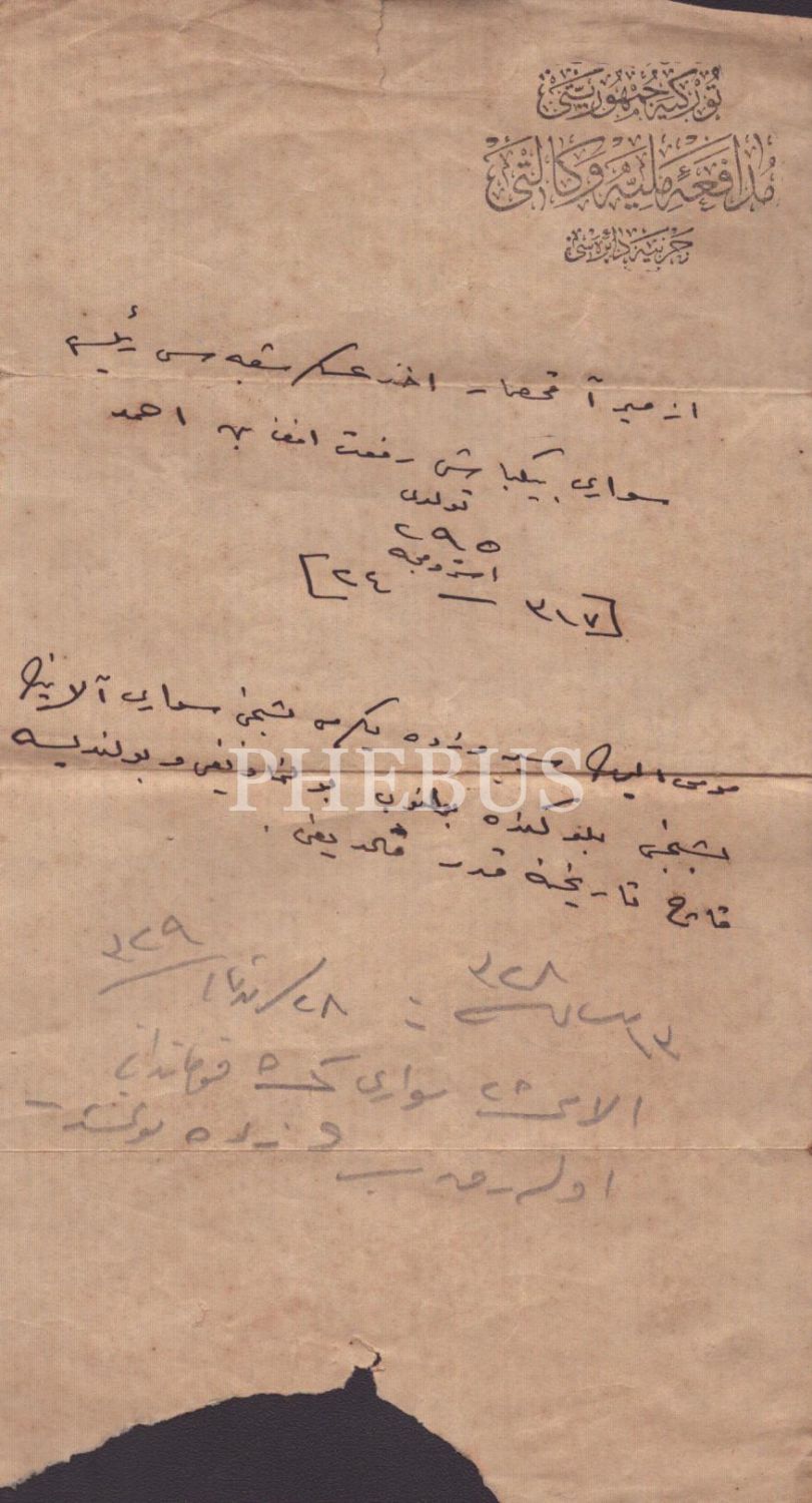 T.C. Müdafaa-i Milliye Vekaleti Harbiye Dairesi antetli, İzmir Akhisar Asker Alım Şubesi Reisi hakkında devamlılık raporu, 1329, 11x21 cm