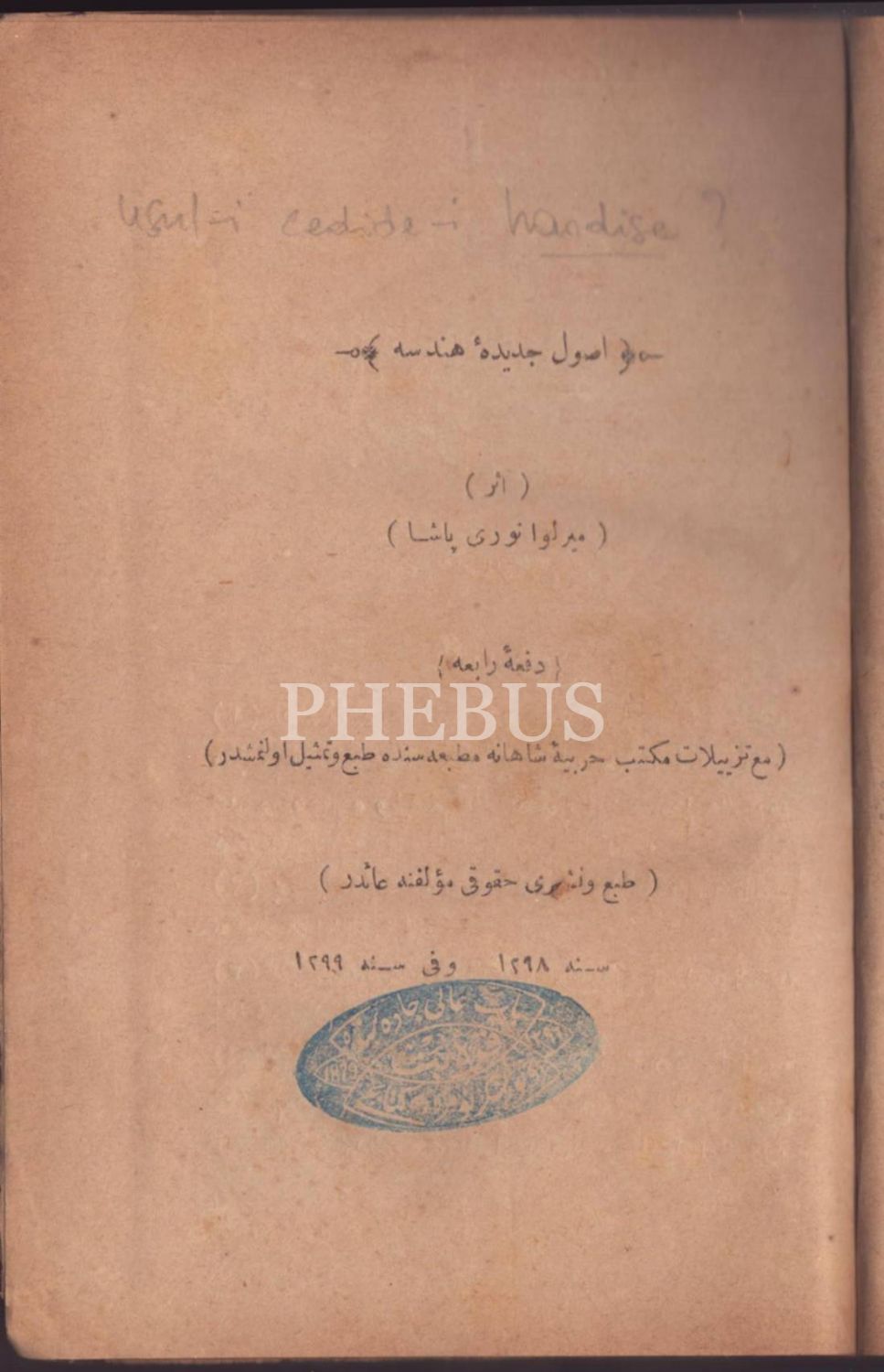 USÛL-İ CEDÎDE-İ HENDESE, Mirliva Nuri Paşa, Mekteb-i Fünun-ı Harbiye-i Şahane Matbaası, 1299, 352 s., 15x22 cm