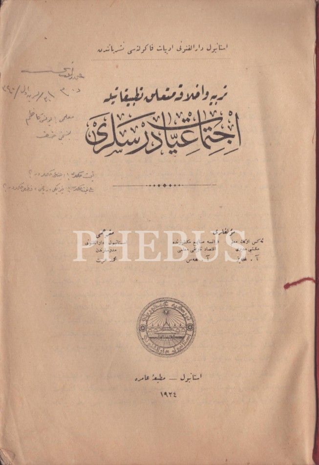 Terbiye ve Ahlâka Müteallik Tatbîkâtıyla İCTİMÂİYYÂT DERSLERİ [Sosyoloji], A. Glaise & A. Hess, çev. Mehmed İzzet, Amire Matbaası, İstanbul 1924, 335 s., 17x25 cm