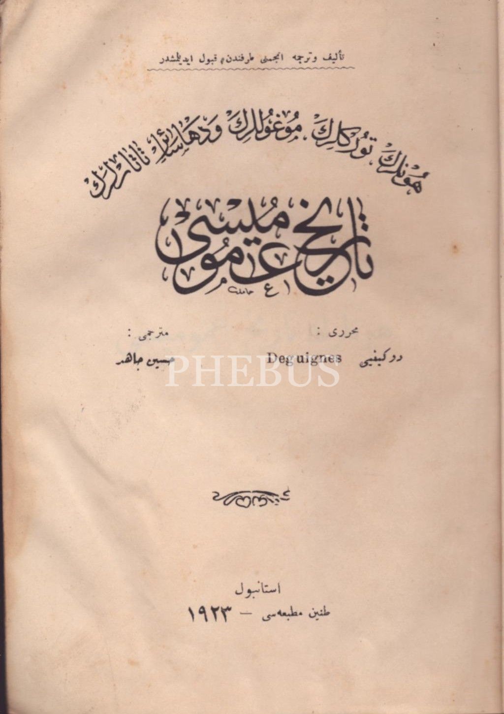 HUNLARIN, TÜRKLERİN, MOĞOLLARIN VE DAHA SÂİR TATARLARIN TÂRÎH-İ UMÛMÎSİ (2. Cilt), Deguignes, çev. Hüseyin Cahid, Tanin Matbaası, İstanbul 1923, 512 s., 14x20 cm