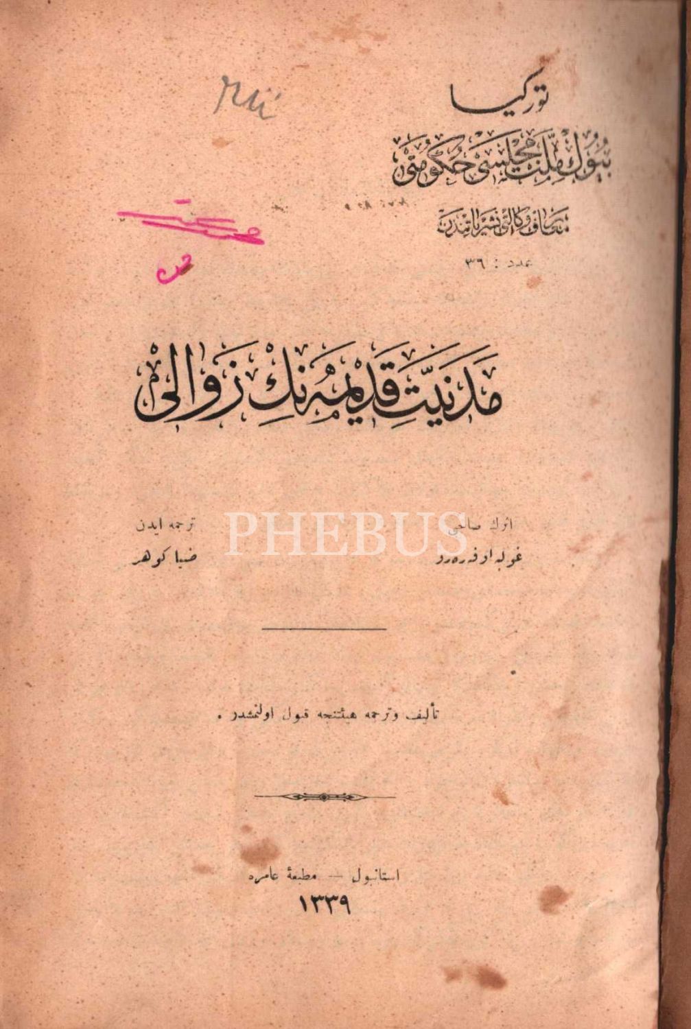 4 eser tek ciltte: MEDENİYYET-İ KADÎMENİN ZEVÂLİ, Guglielmo Ferrero, çev. Ziya Gevher, Amire Matbaası, İstanbul 1339, 99 s.;