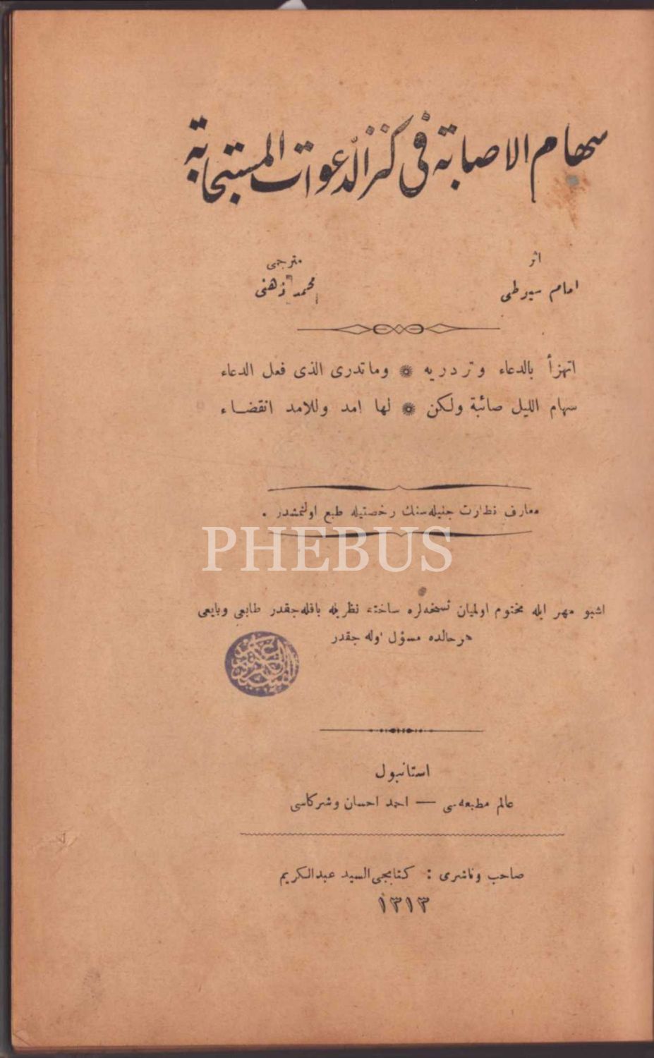 Ay yıldızlı cildinde, İmam Celaleddin Suyuti´ye ait 2 eserin tercümesi bir arada: SİHÂMÜ´L-İSÂBE FÎ KENZİ´D-DEAVÂTİ´L-MÜSTECÂBE, çev. Mehmed Zihni, Alem Matbaası, İstanbul 1313, 23 s.;