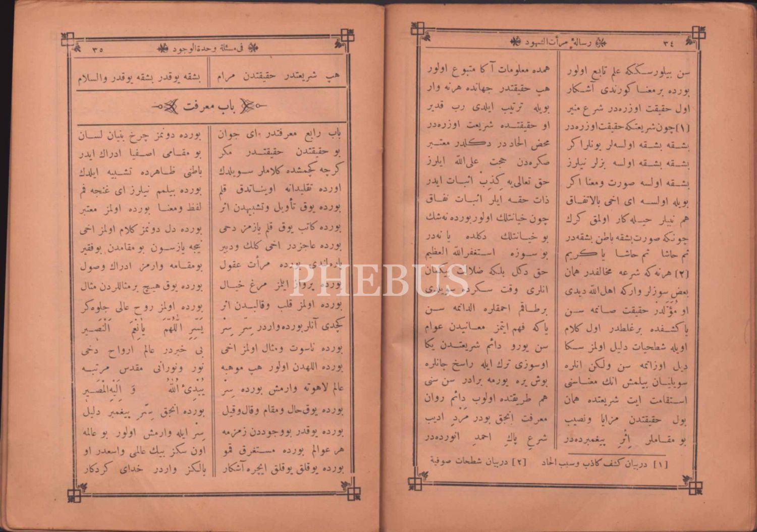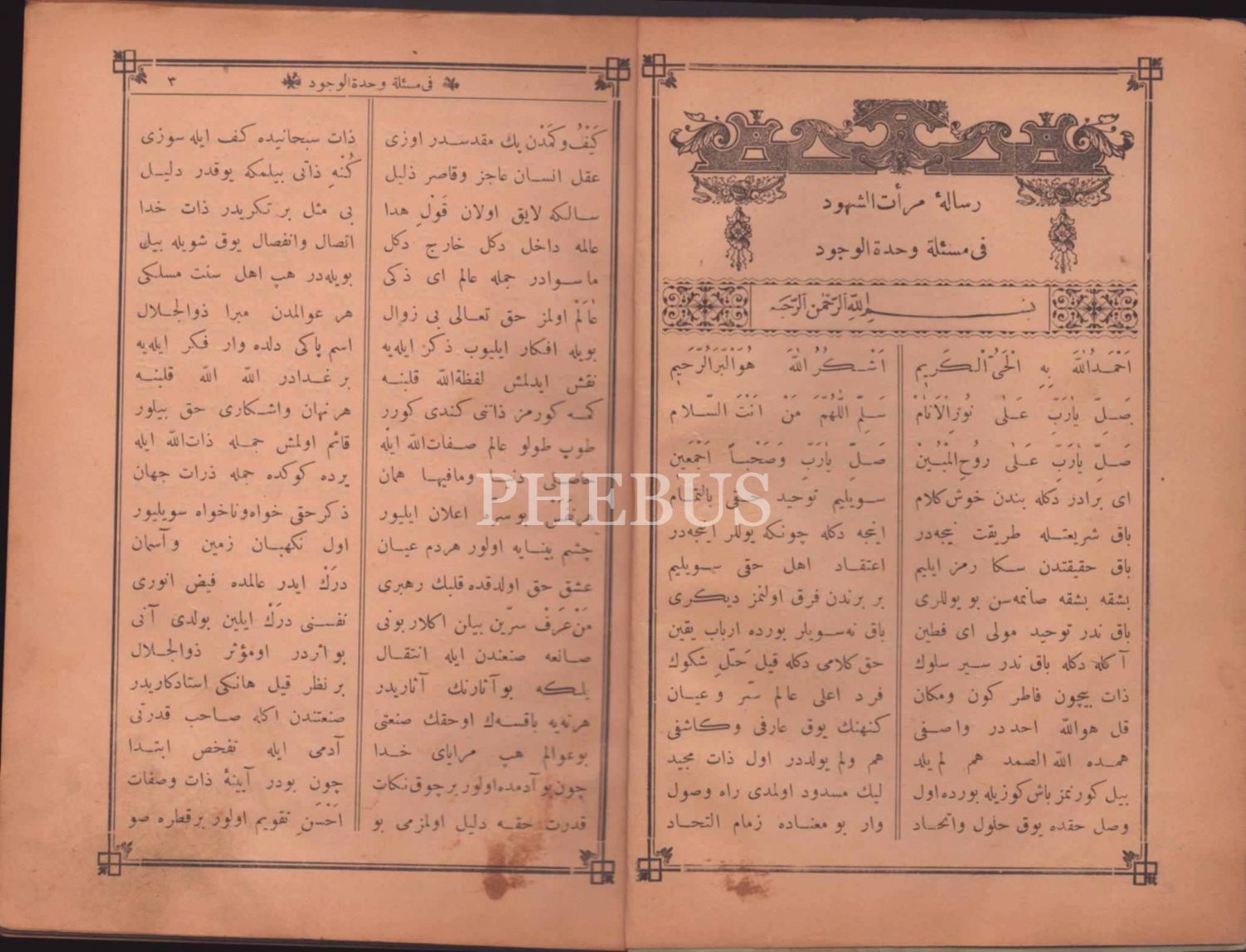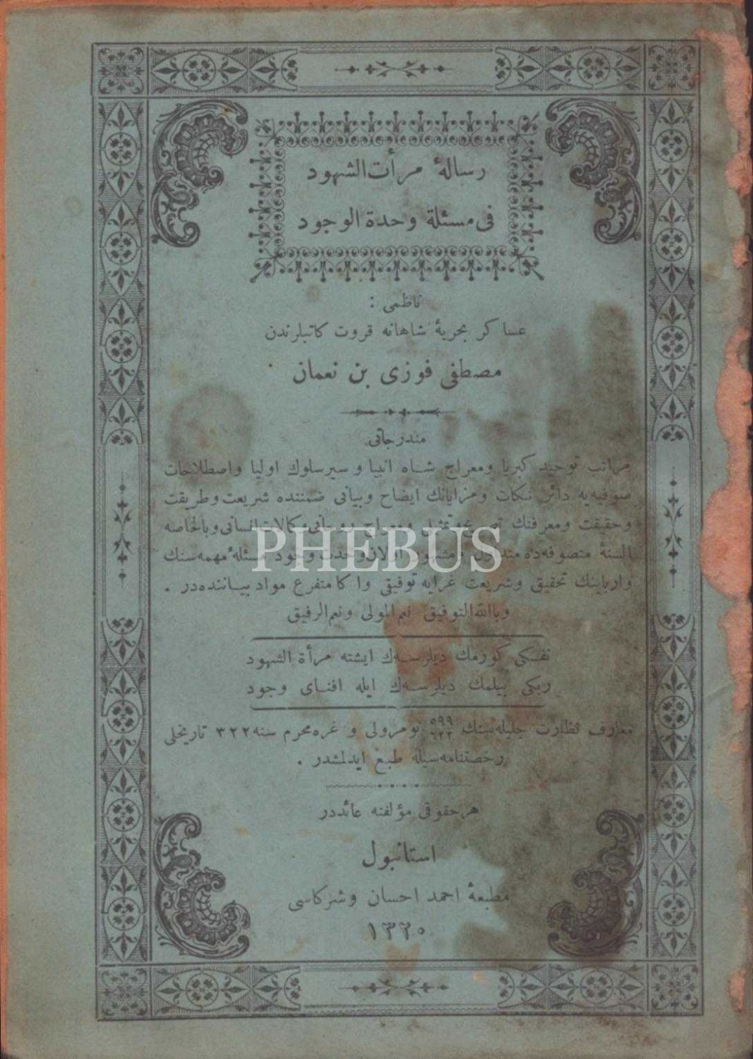 RİSÂLE-İ MİR´ÂTİ´Ş-ŞÜHÛD FÎ MES´ELET-İ VAHDETİ´L-VÜCÛD, Mustafa Fevzi b. Numan, Ahmed İhsan ve Şürekası Matbaası, İstanbul 1320, 83 s., 14x20 cm