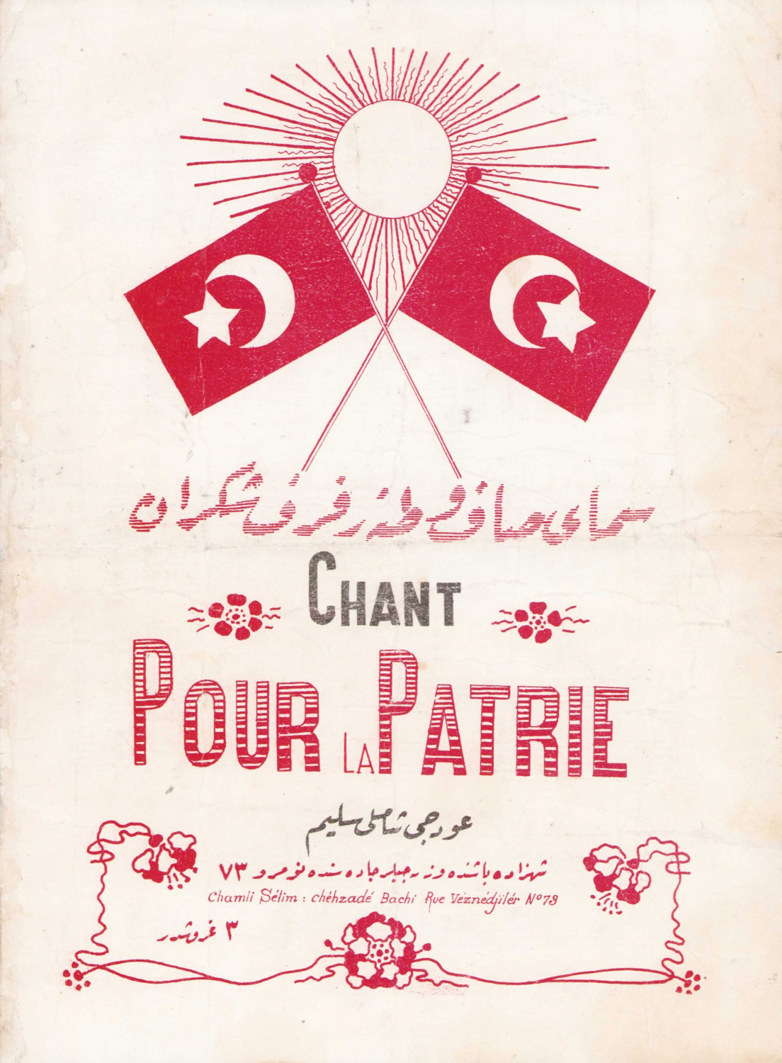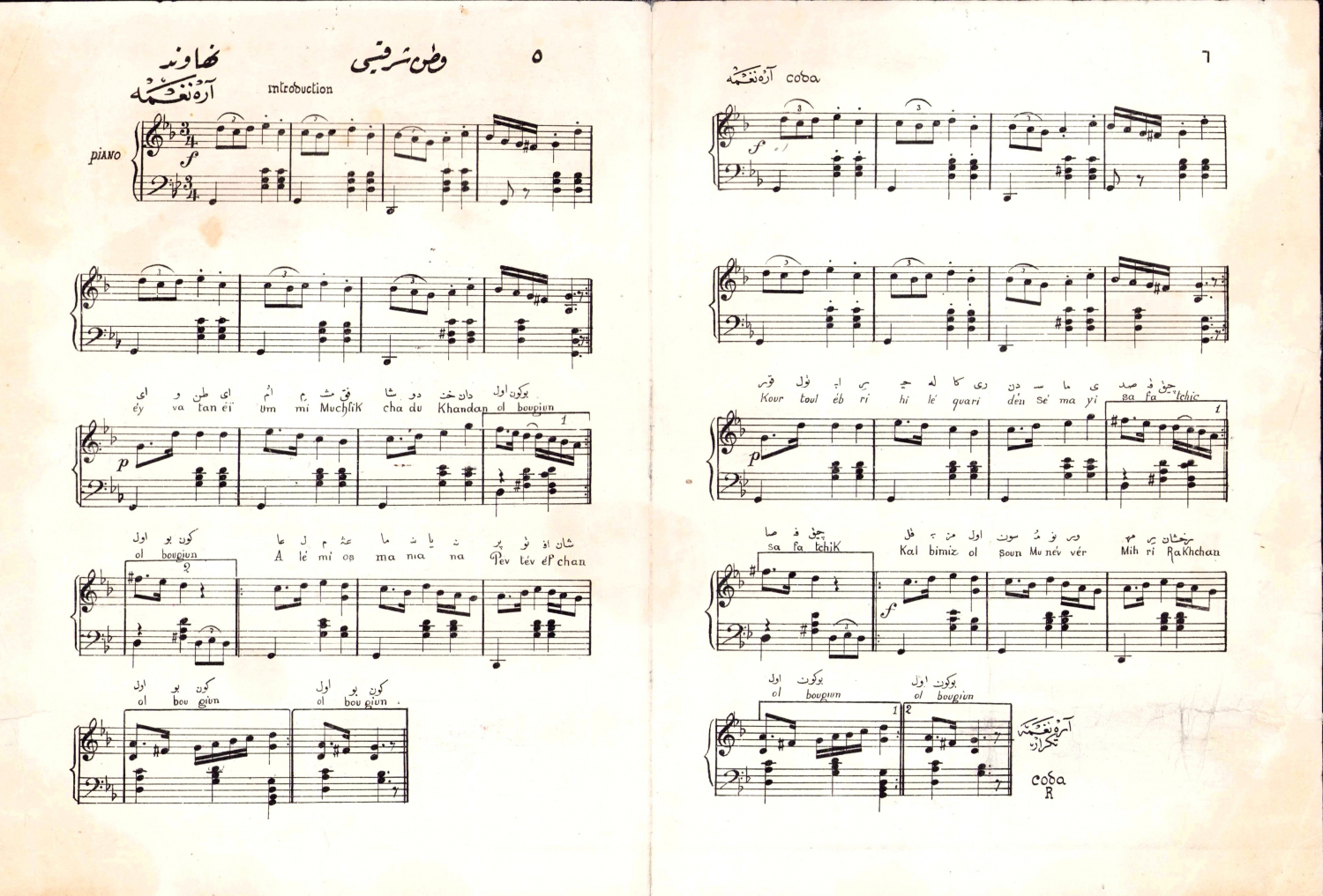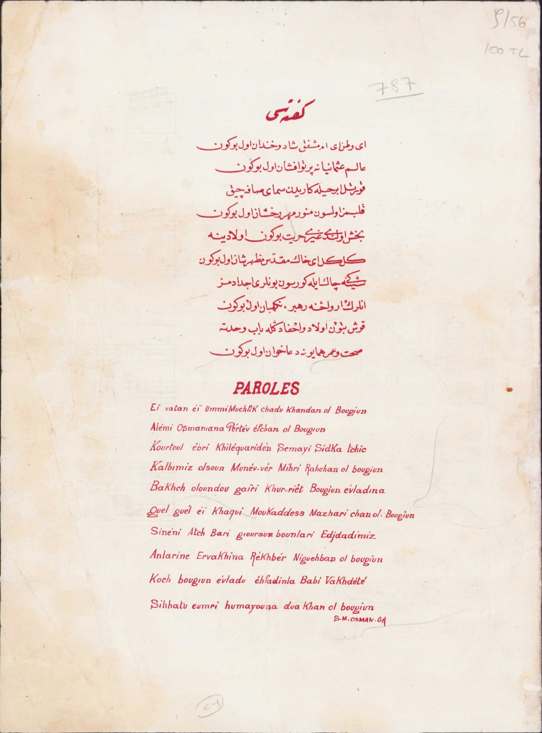 Udçu Şamlı Selim'in Vatan Şarkısı'nın notası, Osmanlıca-Fransızca, 21x28 cm