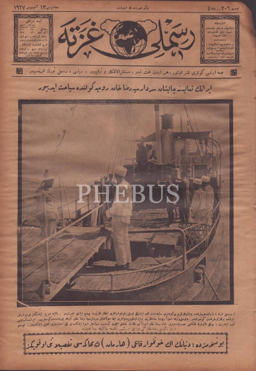 Her şeyden bahseden terakkiperver, siyasi RESİMLİ GAZETE´nin Urumiye gölünde seyahat eden Rıza Han görseliyle 206. sayısı, 13 Ağustos 1927, 27x40 cm
