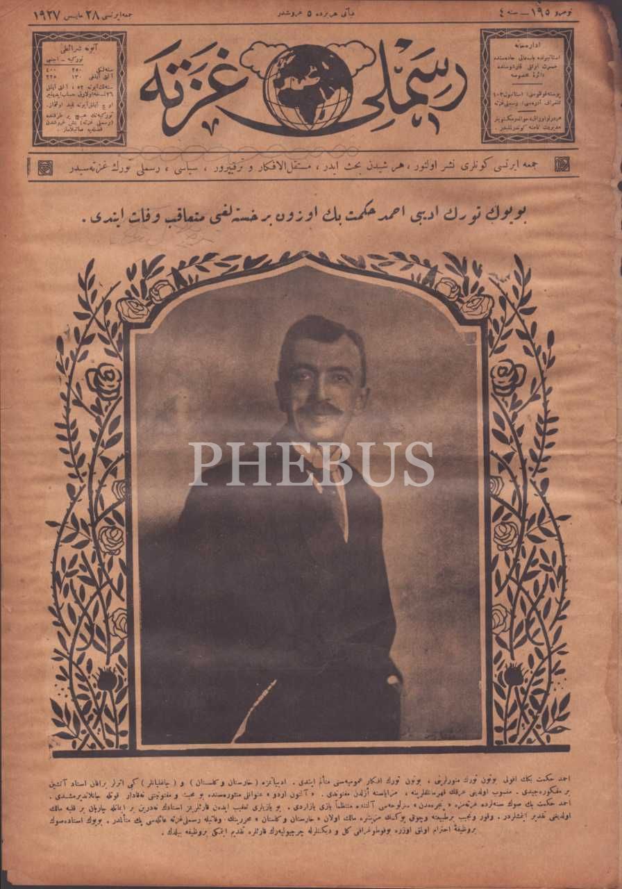 Her şeyden bahseden terakkiperver, siyasi RESİMLİ GAZETE´nin edebiyatçı Ahmed Hikmet Bey'in vefatına ilişkin kapak görseliyle 195. sayısı, 28 Mayıs 1927, 27x40 cm