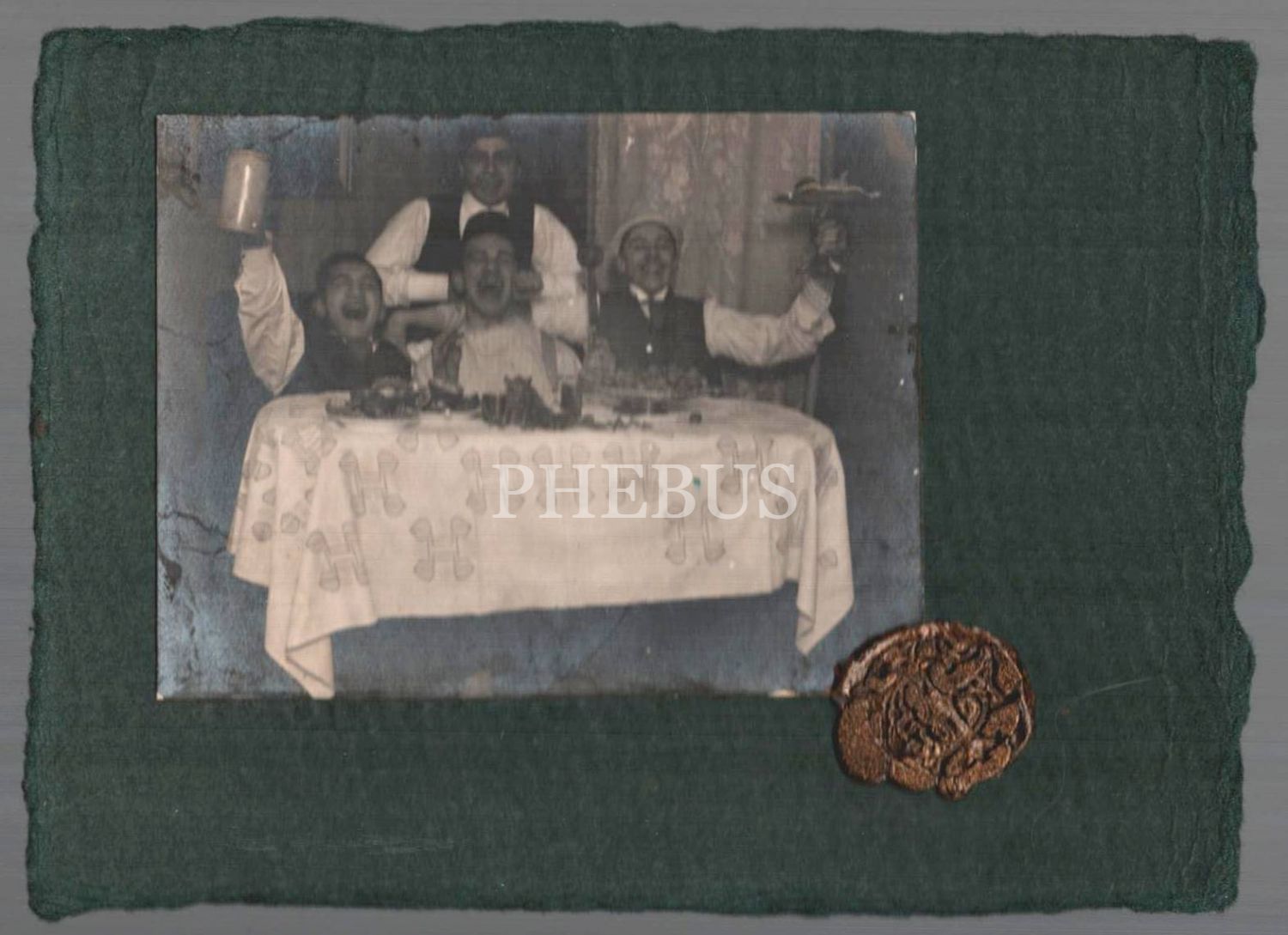 Elinde biraları ve meyve tabaklarıyla âlem yapan neşeli gençlerin hatıra fotoğrafı, 9x12 cm