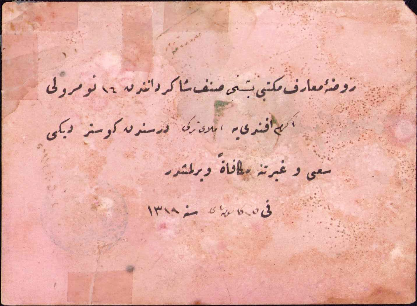 Ravza Maarif Mektebi, beşinci sınıf talebesi Ekrem Efendi'nin imla ve Türkçe dersinde gösterdiği gayretten dolayı verilen aferin, 1319 tarihli, 12x9 cm, haliyle