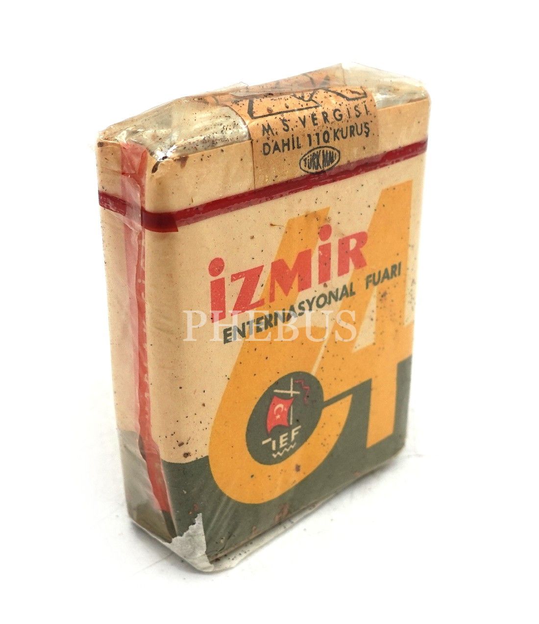 Tütün tarihi: açılmamış ambalajında IEF (İzmir Enternasyonal Fuarı), T.C. Tekel İdaresi, "27 Mayıs Milletçe Eleleyiz" etiketli, 5x7x2 cm