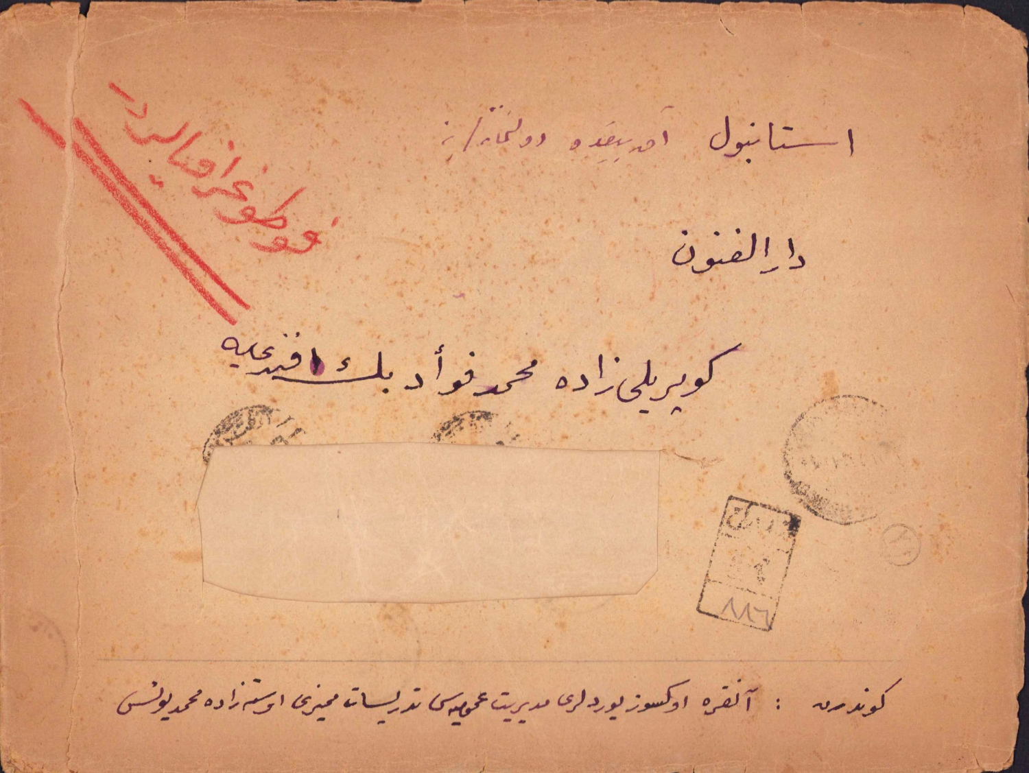 Ankara Öksüz Yurtları Müdürü Mehmet Yunus'tan Köprülüzade Mehmet Fuat Bey'e gönderilmiş İstanbul Darülfun konulu zarf, Osmanlıca, 24x19 cm, haliyle
