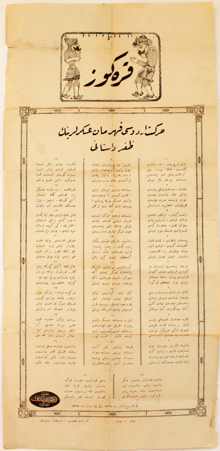 Karagöz Gazetesi, propaganda eki, 'Hareket ordusu kahraman askerlerinin zafer destanı', İstanbul Bekir Efendi Matbaası baskısı, 1909 tarihli, 27,5x57 cm