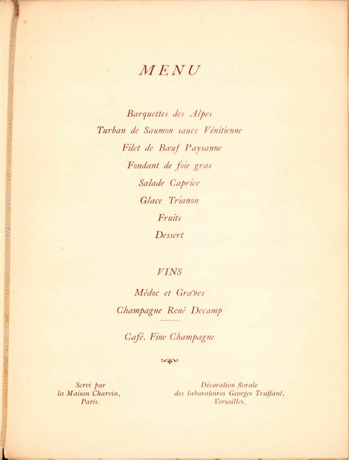 1923'te Louis Pasteur'ün doğumunun yüzüncü yılı dolayısıyla Versay Sarayı'nda düzenlenen ziyafetin Fransızca menüsü, Dr. Rıza Isfahani imzalı, 15,5x21cm.