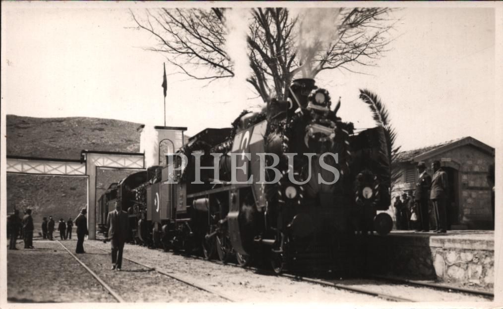 Demiryolu hattının açılış kutlamalarına özel bayraklarla süslenmiş lokomotif, 9x14 cm