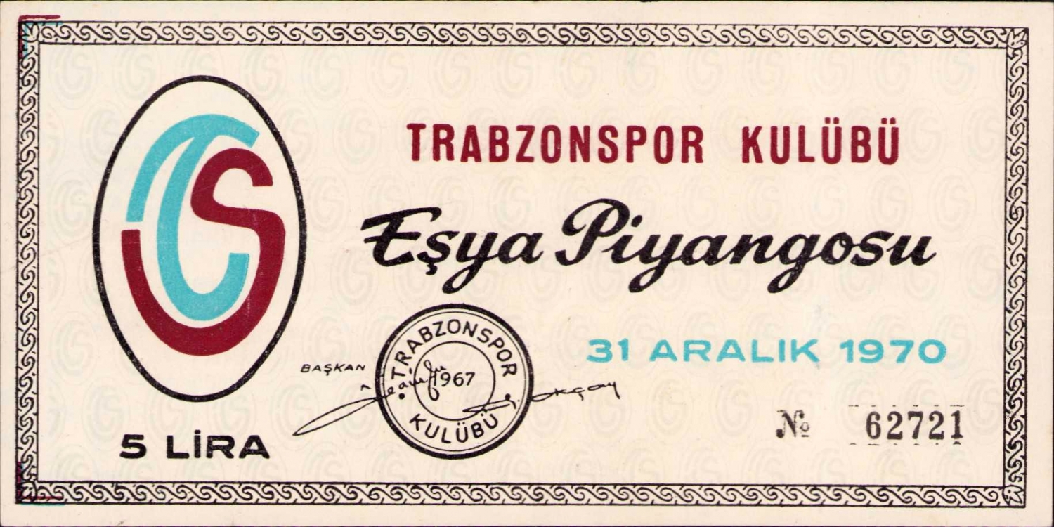 Trabzonspor Klübü Eşya Piyangosu - 31 Aralık 1970, 5 Lira, 15,5x7,5 cm.