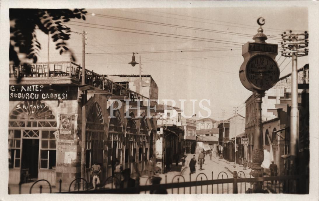 Fotoğrafın detaylarında Zenith marka 1932 tarihli saat, arka dükkanda Moda Berber Salonu tabelası, ve cadde üzerine insanlar görülmektedir.